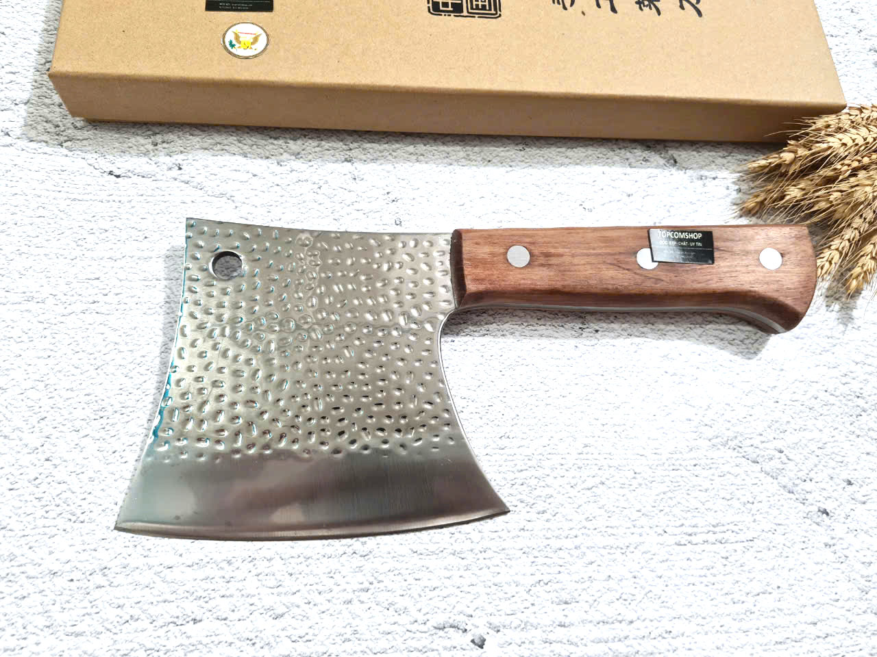 - Chức năng: Chặt xương ống, chân giò, trâu bò - Kích thước: Lưỡi: 22cm, cán: 10cm, rộng: 10cm, dầy: 5ly, trọng lượng: 800g - Cán : Gỗ mun, Khâu đồng đỏ , chốt đinh