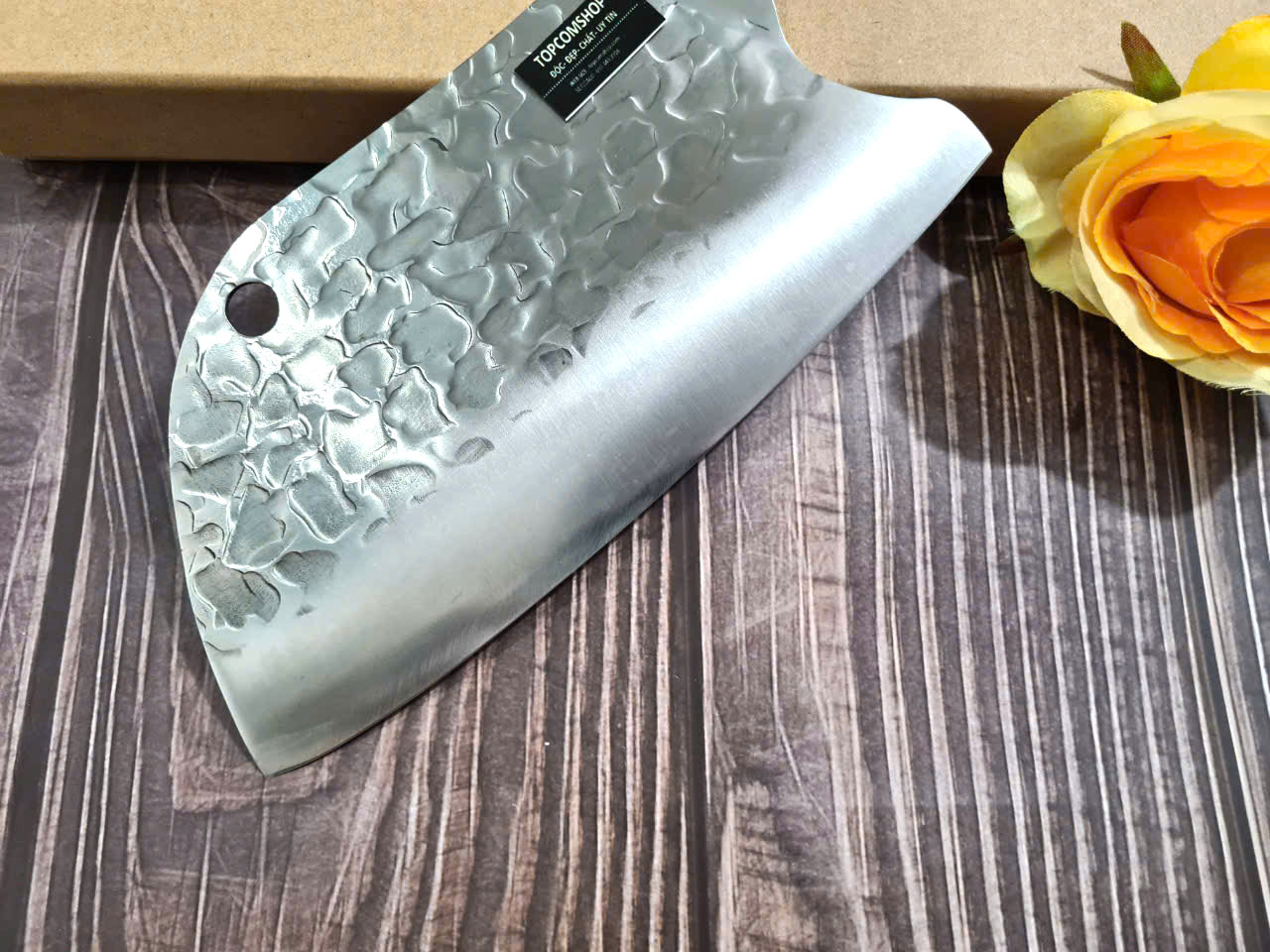 - Chức năng: Chặt xương ống, chân giò, trâu bò - Kích thước: Lưỡi: 22cm, cán: 10cm, rộng: 10cm, dầy: 5ly, trọng lượng: 800g - Cán : Gỗ mun, Khâu đồng đỏ , chốt đinh