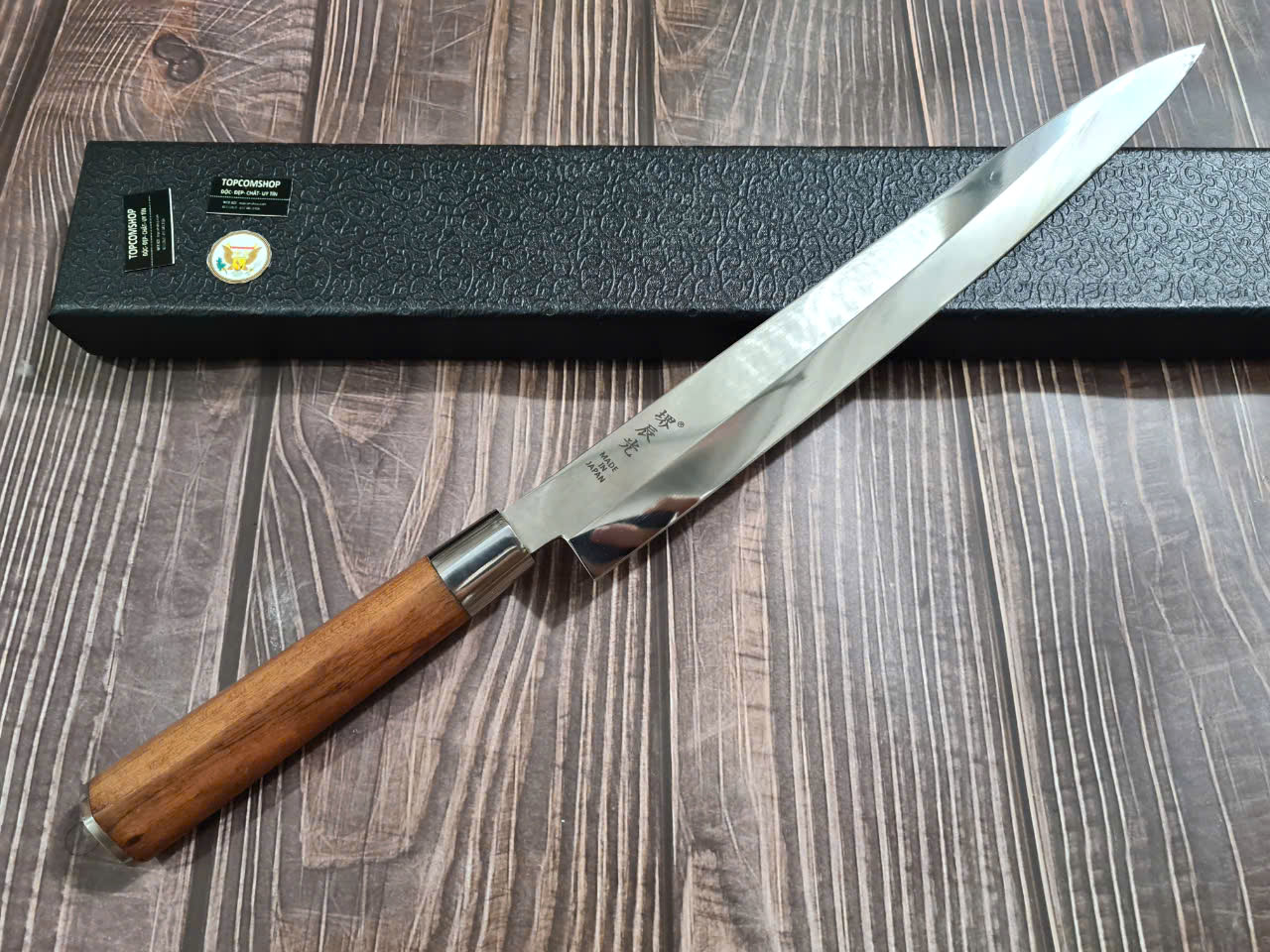 Dao Phúc Sen bản Takohiki - Kích thước: lưỡi: 24cm, cán: 12cm, rộng: 3.5cm, dầy: 2.5 ly, trọng lượng: 200g - Chức năng: sử dụng chuyên thái thịt ,cá, rau củ và các thực phẩm