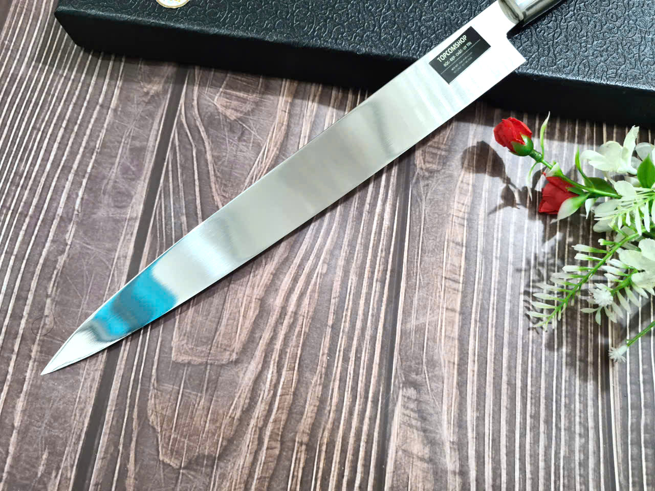 DAO BẾP SASHIMI MẶT HOA VĂN MÃ N4 THÔNG TIN SẢN PHẨM TỔNG DÀI : 45cm, LƯỠI: 30cm,RỘNG : 4cm, dày: 2.5mm, CHẤT liệu lưỡi: thép IFA cao cấp Chất liệu CÁN: gỗ Cẩm chỉ,