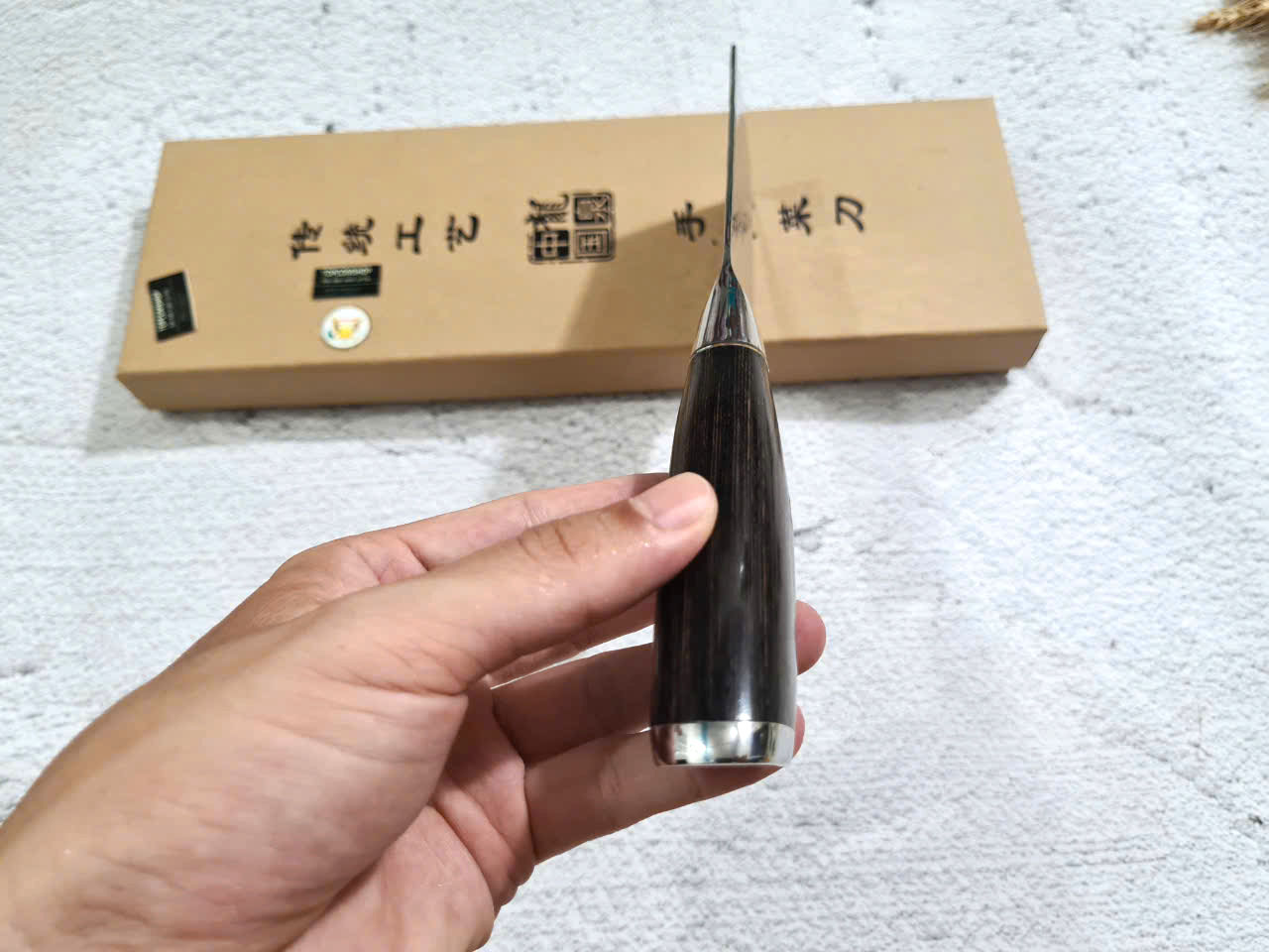 - Chức năng: thái thịt, rau củ quả - Kích thước: Lưỡi: 17cm, cán: 12cm, rộng: 5cm, dầy: 1ly, trọng lượng: 200g - Cán : Gỗ cẩm chỉ, Chốt, Khâu ĐỒNG ĐỎ , keo liên