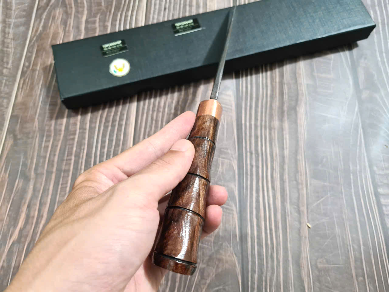 Cán gỗ cẩm chỉ núi đá kết hợp với khâu đồng đỏ được chốt đinh tán và keo liên kết đảm bảo độ bền chắc.