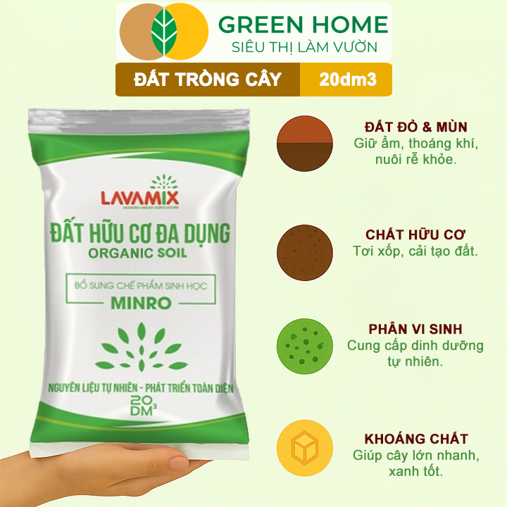 Đất trồng cây Lavamix với thành phần là đất mùn phù sa và các chất hữu cơ tự nhiên giàu dinh dưỡng; khoáng chất đa, trung, vi lượng; vi sinh vật có ích và nguồn hữu cơ sinh học Minro.