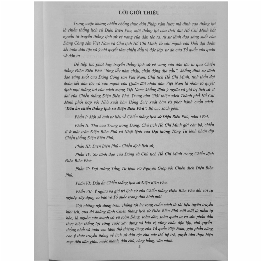 Để tiếp tục phát huy truyền thống lịch sử vẻ vang của dân tộc ta qua Chiến thắng Điện Biên Phủ “lừng lẫy năm châu, chấn động địa c ầu”, khẳng định sự lãnh đạo sáng suốt của Đảng Cộng sản Việt Nam, Chủ tịch Hồ Chí Minh, tinh thần đại đoàn kết dân tộc và sức mạnh của Quân đội nhân dân Việt Nam là nhân tố quyết định mọi thắng lợi của cách mạng Việt Nam; khẳng định ý nghĩa và giá trị lịch sử vĩ đại của Chiến thắng Điện Biên Phủ, Nhà sách Nam Việt xin trân trọng giới thiệu cuốn sách: Dấu ấn chiến thắng lịch sử Điện Biên Phủ