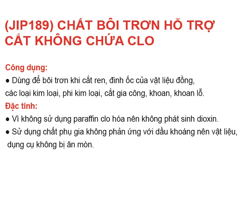 - Dùng để bôi trơn khi cắt ren, đinh ốc của vật liệu đồng, các kim loại, phi kim loại, cắt gia công khoan, khoan lỗ ĐẶC ĐIỂM: