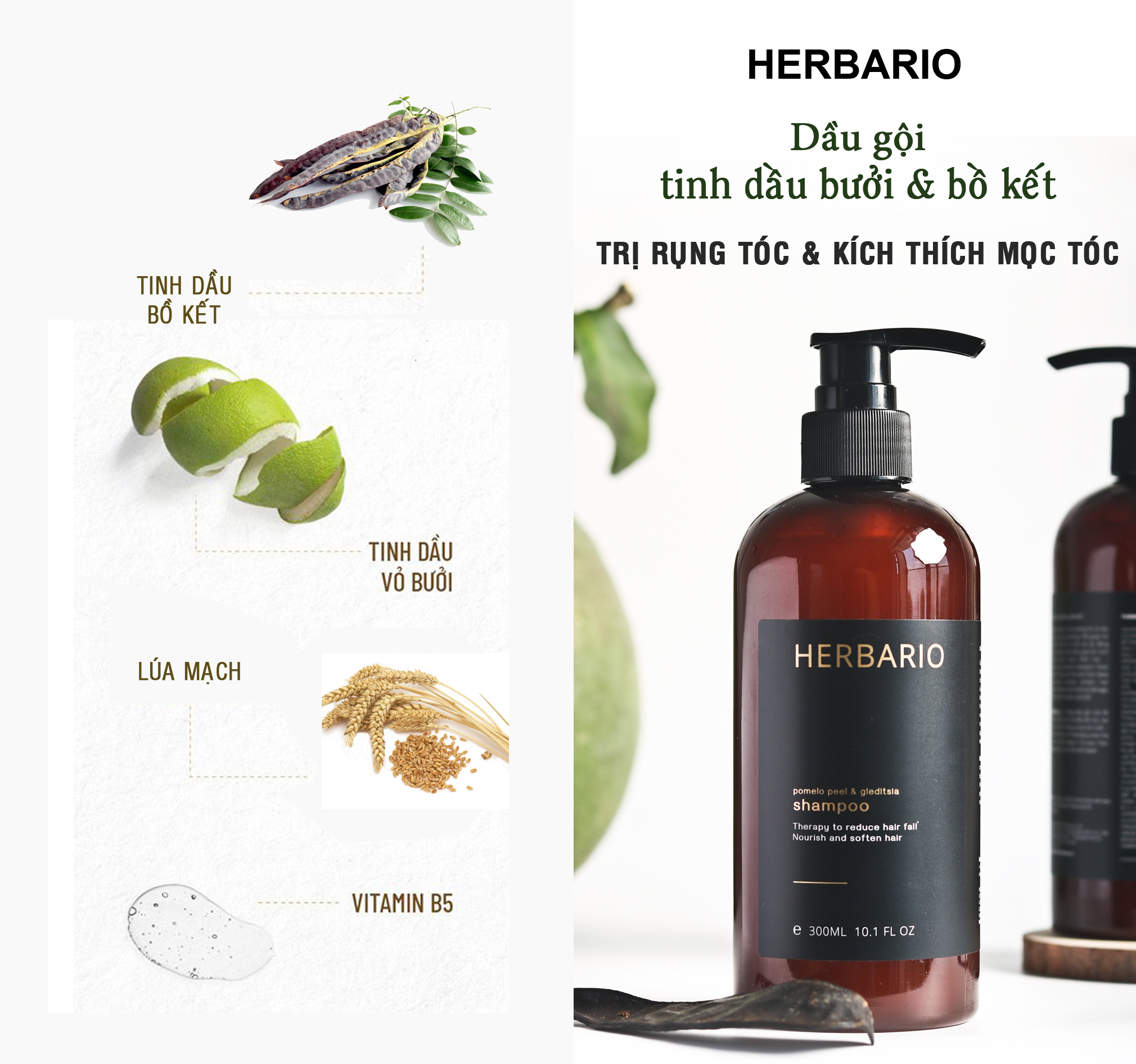 Dầu gội vỏ bưởi & bồ kết HERBARIO giúp giảm rụng tóc*, nuôi dưỡng tóc từ sâu bên trong, cung cấp dưỡng chất giúp tóc chắc khỏe, phục hồi tóc hư tổn do tác động của môi trường và hóa chất, giúp tóc luôn khỏe mạnh, suôn mượt và mềm mại.