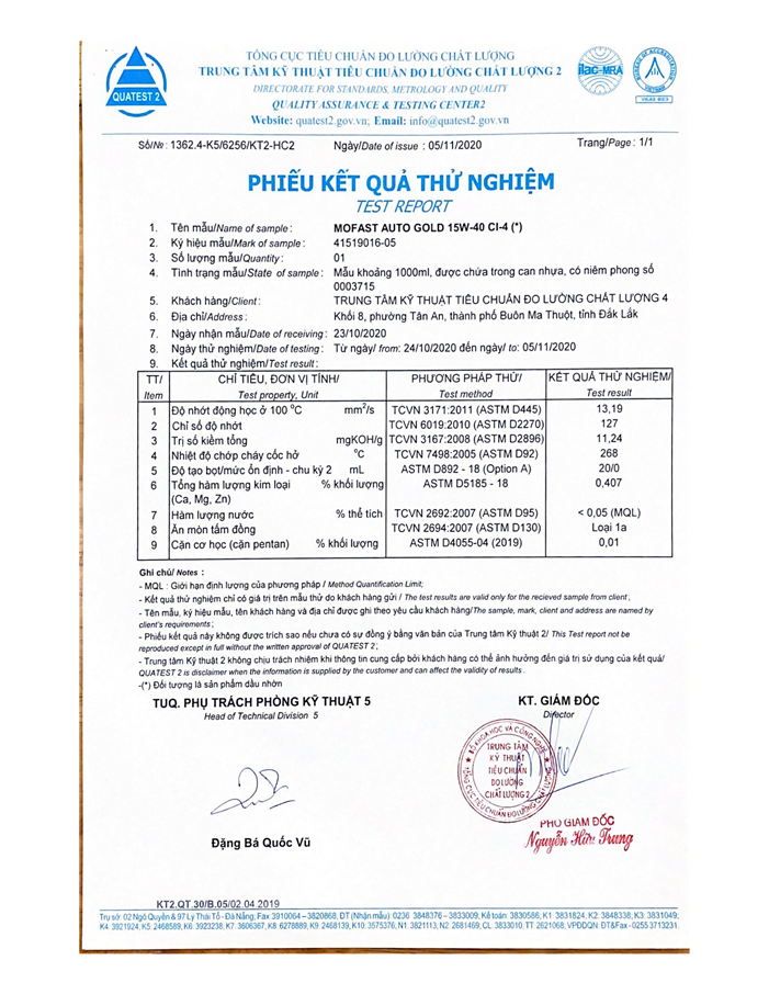 Thông số kĩ thuật: SAE 15W-40 và API CI-4.