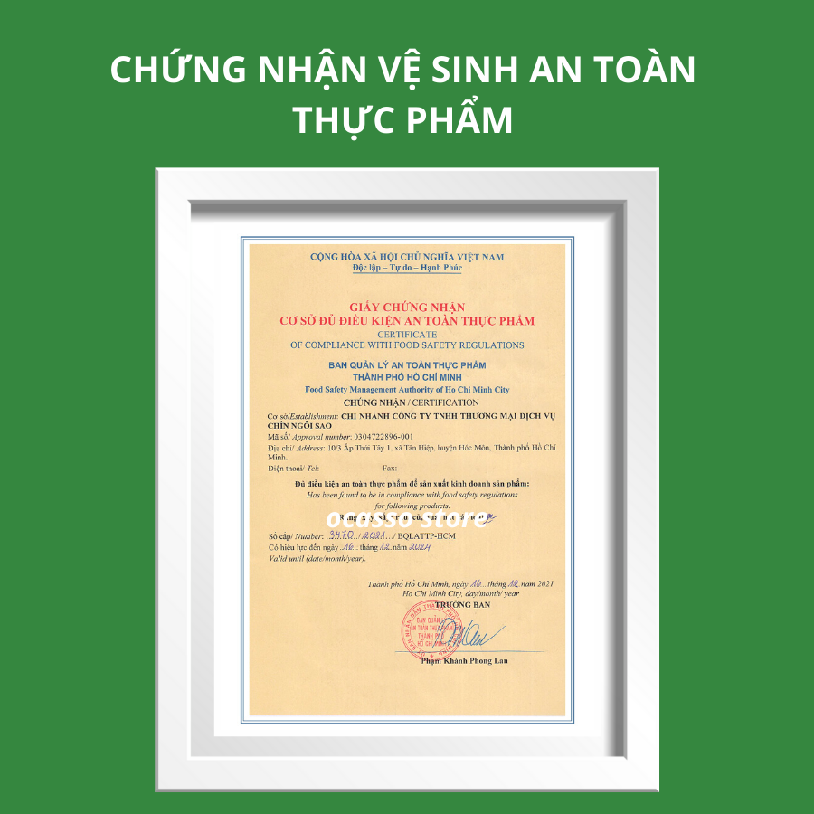 - Được sản xuất theo quy trình khép kín trực tiếp tại hệ thống nhà xưởng của Công Ty Chín Ngôi Sao. Đạt tiêu chuẩn Vệ Sinh An Toàn Thực Phẩm, ISO 22000. Đáp ứng tất cả các nhu cầu phân phối trong nước và xuất khẩu.
