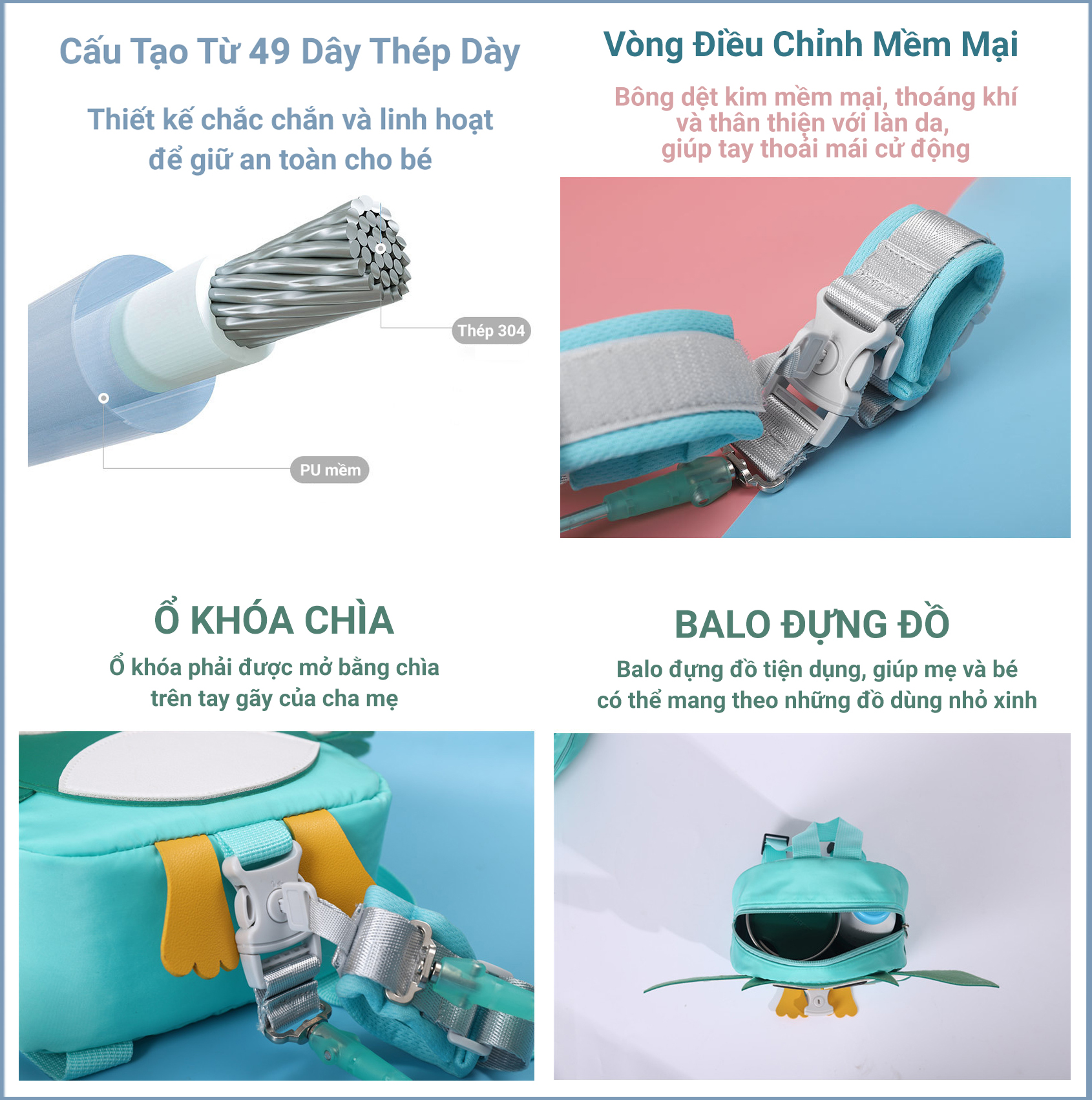 - Dây dắt trẻ em khi đi dạo ngoài trời, giúp bố mẹ an tâm hơn không sợ bị lạc bé. - Khóa bấm có thể khóa lại để bé không thể tự mở ra.