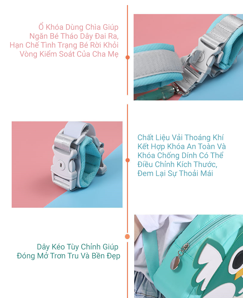 - Dây đai chống lạc, dây dắt trẻ em khi đi dạo ngoài trời, giúp bố mẹ an tâm hơn không sợ bị lạc bé. - Khóa bấm có thể khóa lại để bé không