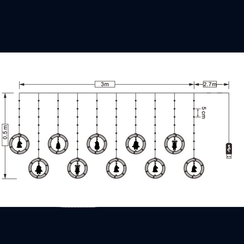 Mua tại TiktokDây LED Rèm Trang Trí Giáng Sinh 10 Chi Tiết Dây led rèm ngang 3m với 10 dây thả xuống, mỗi dây dài 0.3 - 0.5m. Mỗi vòng tròn đi kèm với các biểu tượng giáng sinh gồm người tuyết, ông già Noel, nón và cây thông. Đường kính vòng tròn: 10cm Tổng cộng 125 bóng led Sử dụng nguồn điện 220V thông thường