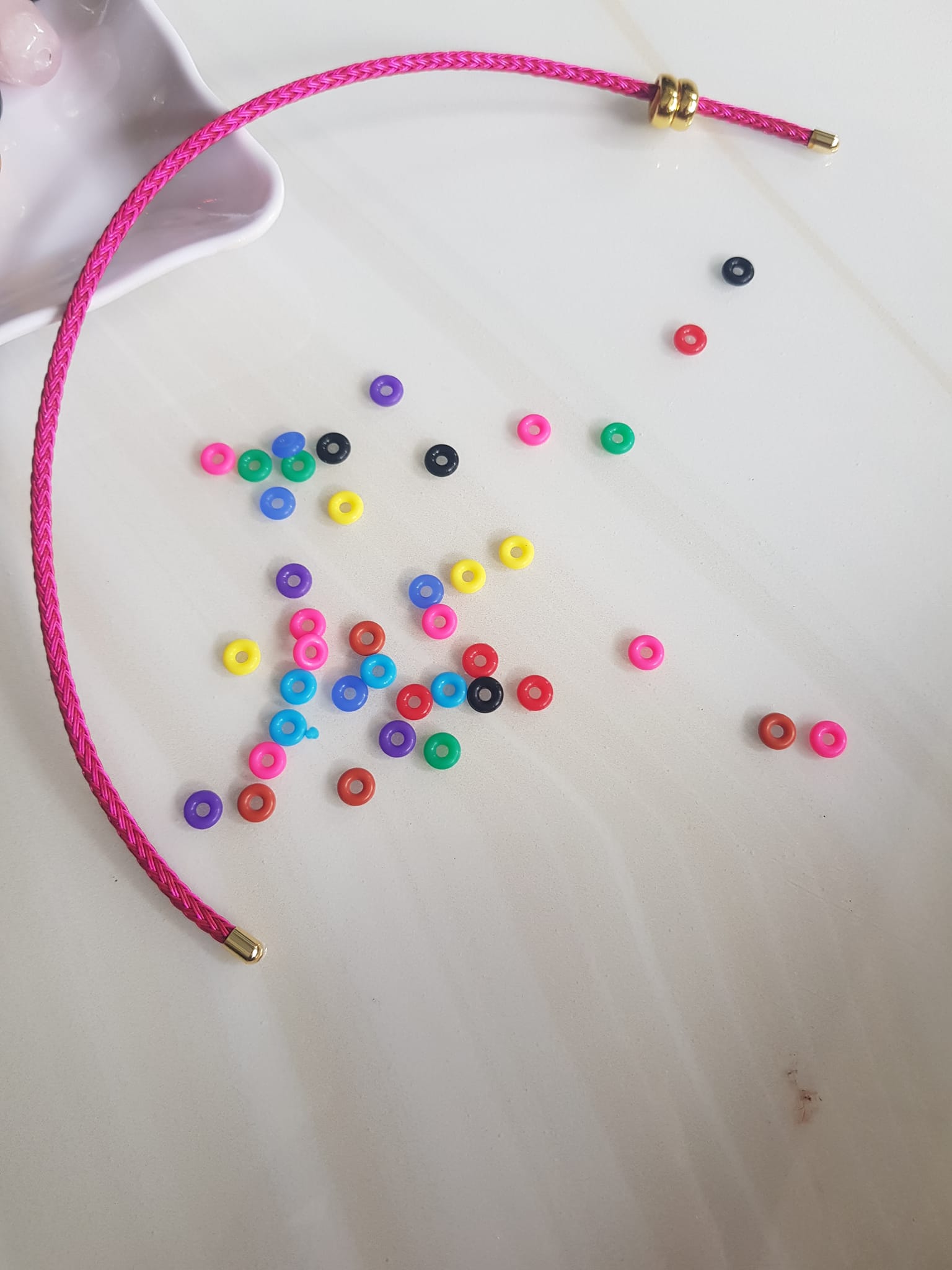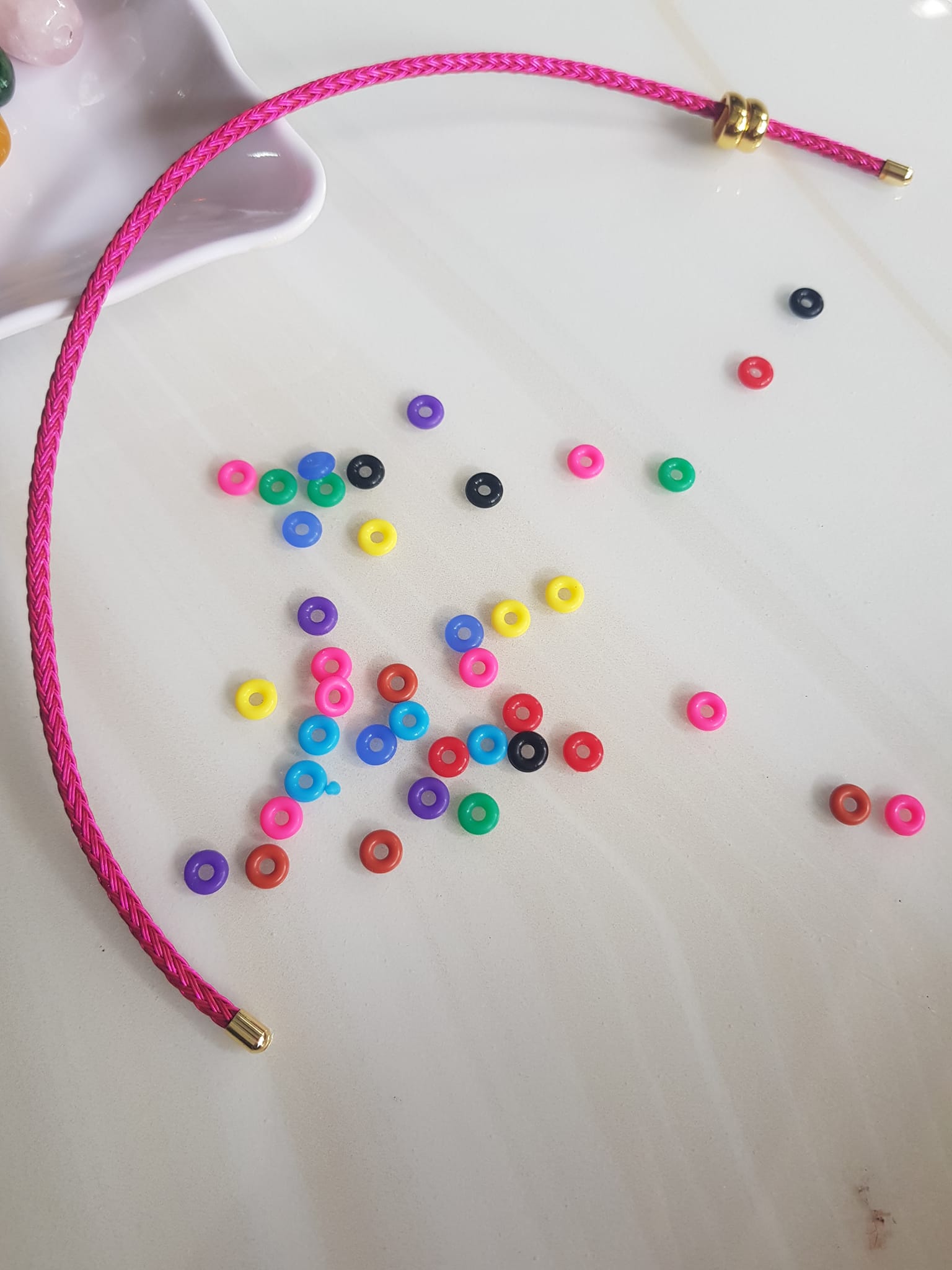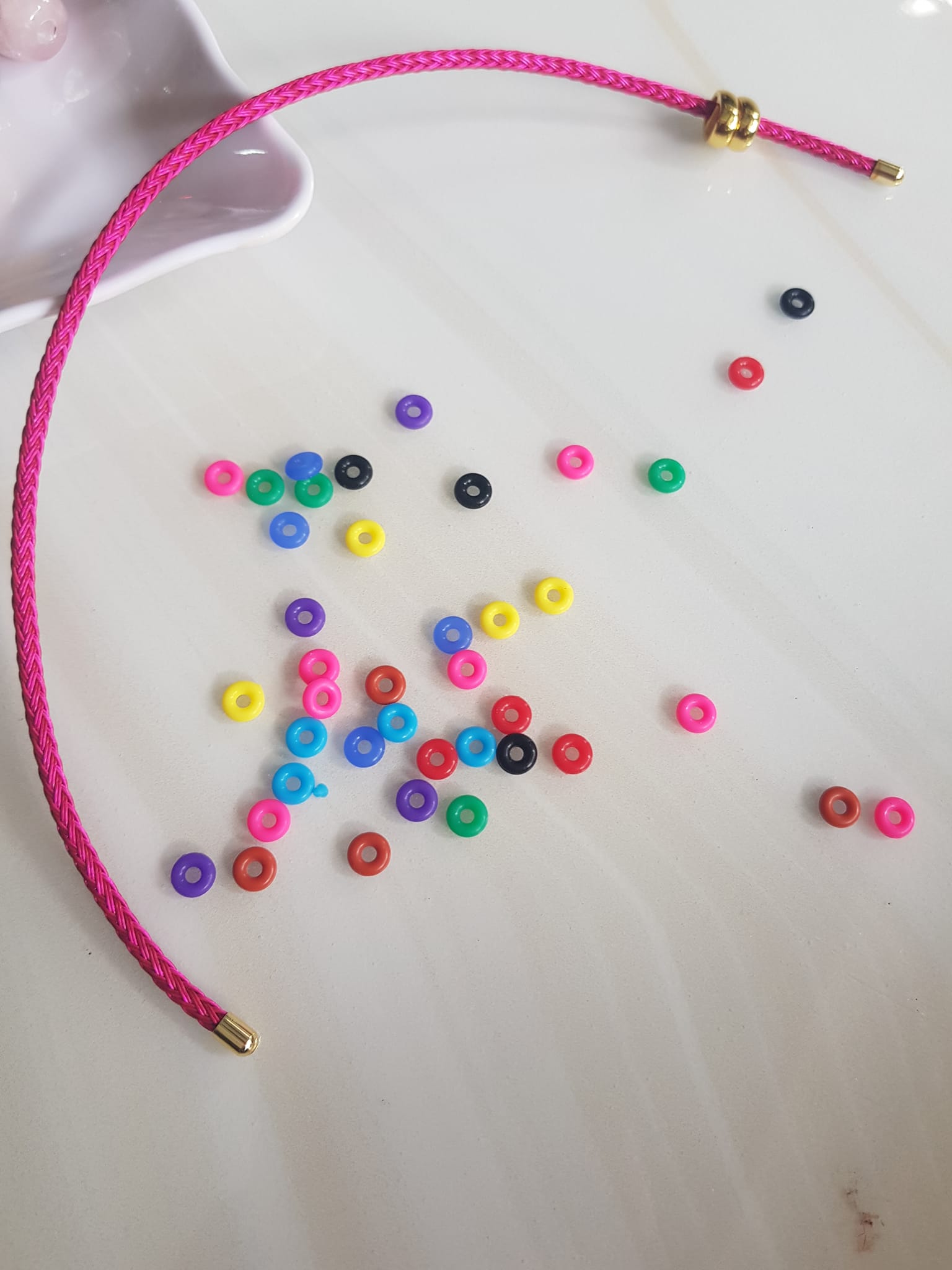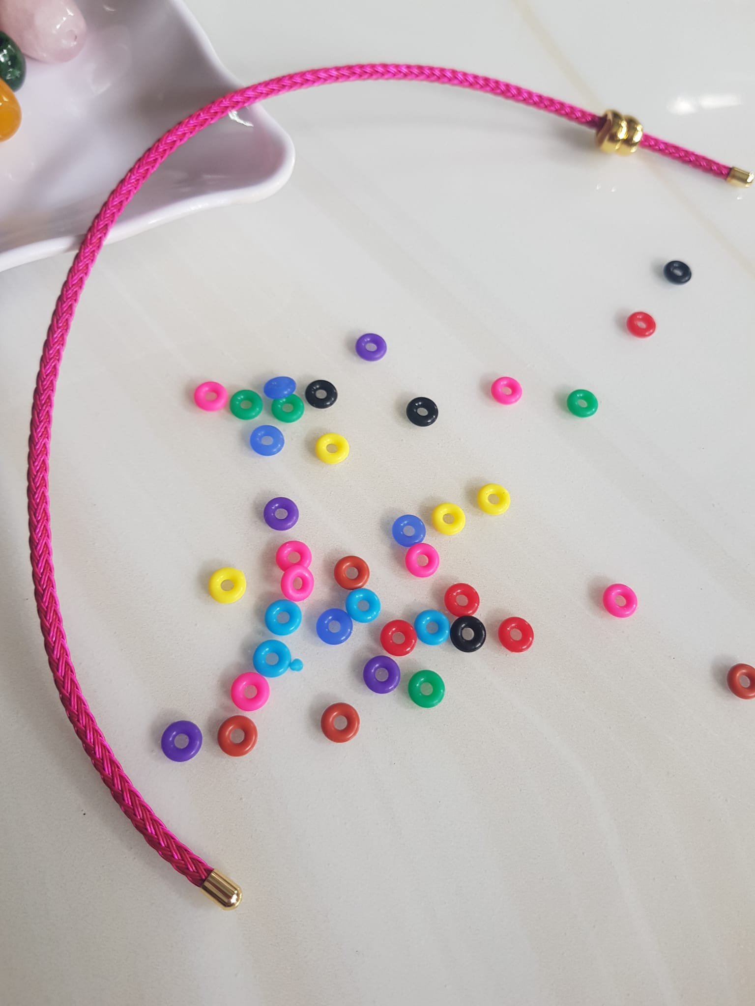 Dây Phối Vòng Tay MÀU HỒNG ĐIỀU ĐẬM ĐẸP DẺO Co Giãn Có 2 Khoen Vàng Nữ Phối Với Hạt Lu Đá Tự Nhiên Các Loại Vào Làm Vòng Đeo Tay Kiểu ạ Size Dây 3mm Nữ Về để Hạt Lu Vào ở Giữa Rút Dây VÀo 2 Lỗ Khoẻn Vàng Trên Dây là đeo đẹp ạ