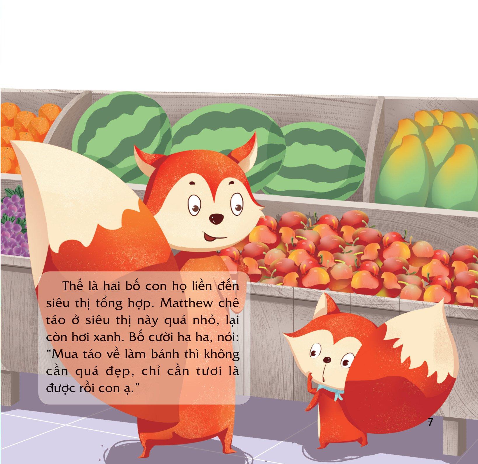 Thế là hai bố con họ liền đến siêu thị tổng hợp. Matthew chê táo ở siêu thị này quá nhỏ, lại còn hơi xanh. Bố cười ha ha, nói: