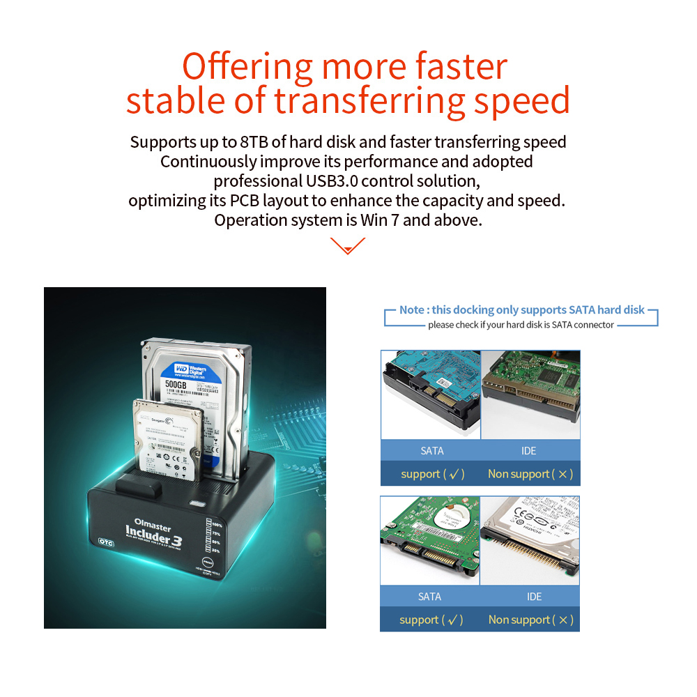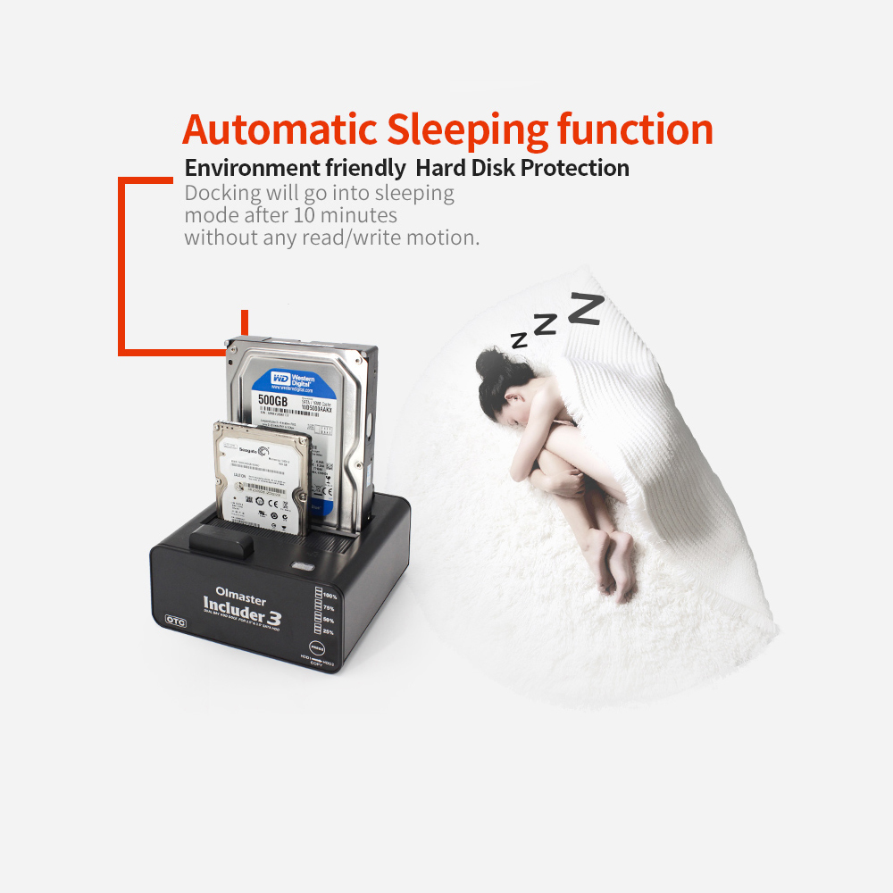 It supports 2 different sizes of SATA hard disk to work simultaneously. Plugand play.