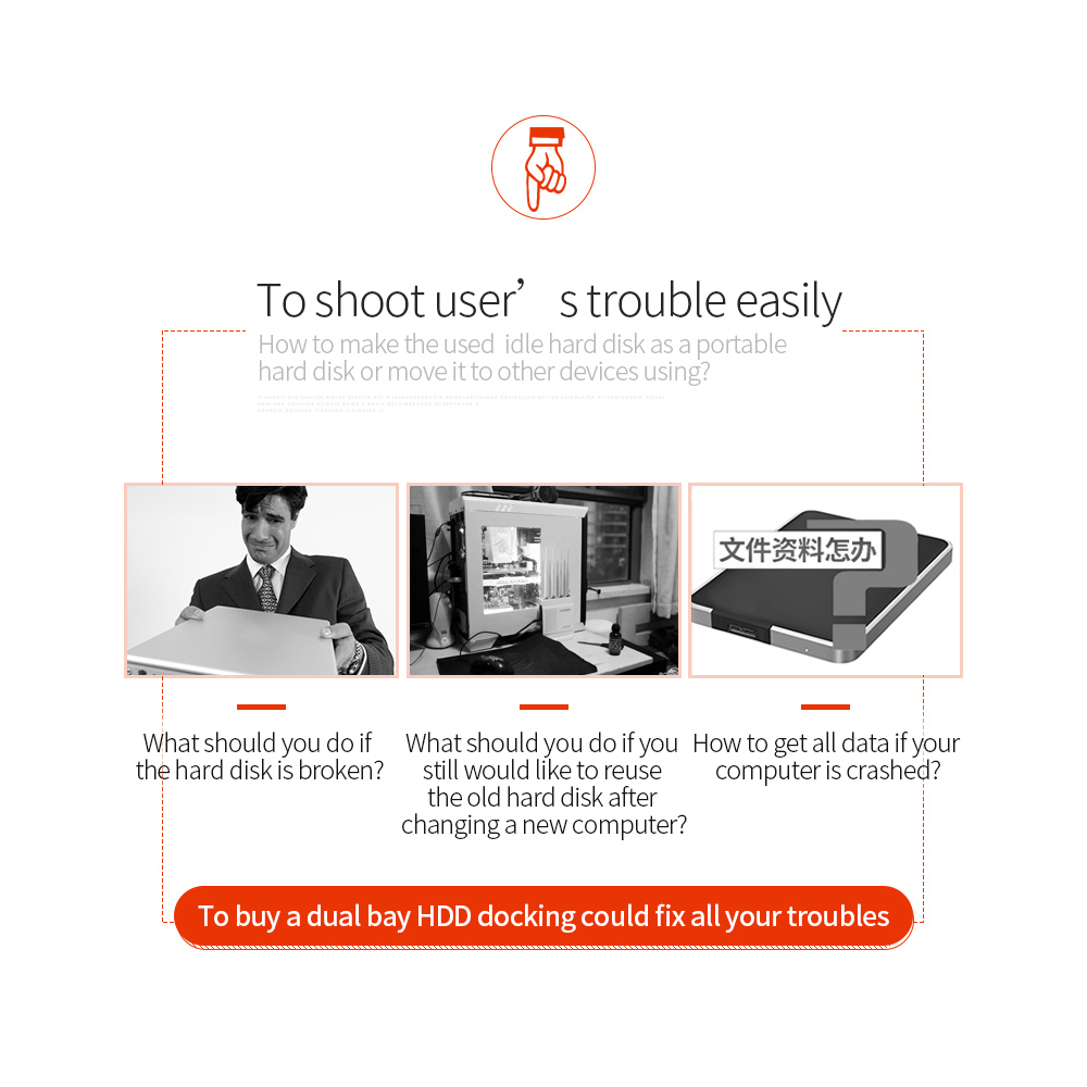 The USB3.0 product is classic and fashion, engineering plastics. Small and exquisite. Easy to carry. Dust cover design. Protect front end SATA connector. The raised button is convenient for user to take out hard drive.