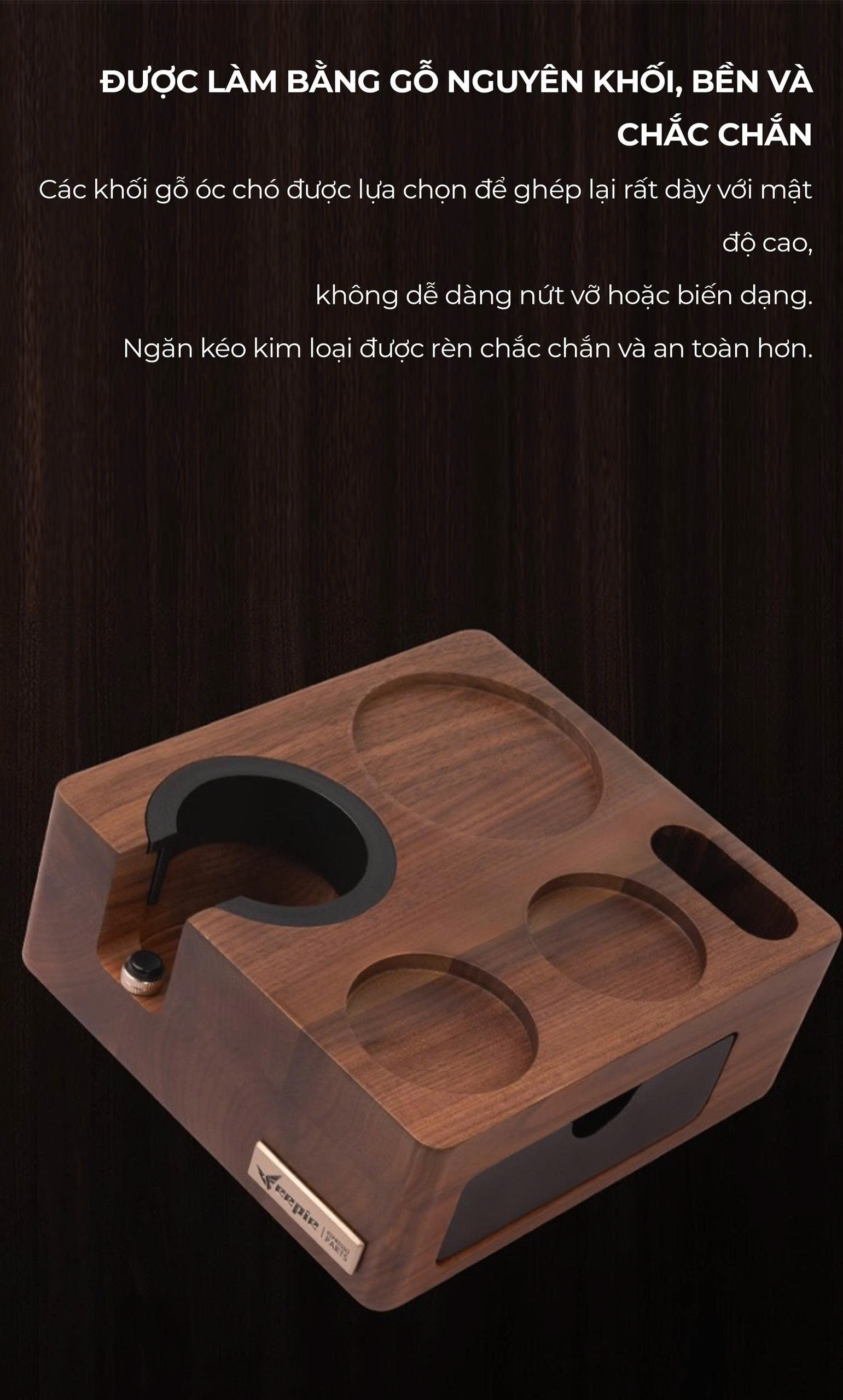 GIÁ ĐỠ TAMPER BẰNG GỖ TỰ NHIÊN PHA CÀ PHÊ MÁY ESPRESSO CAFE DE KONA Khối gỗ được làm bằng 2 loại gỗ: gỗ óc chó đen và gỗ giẻ gai châu âu.