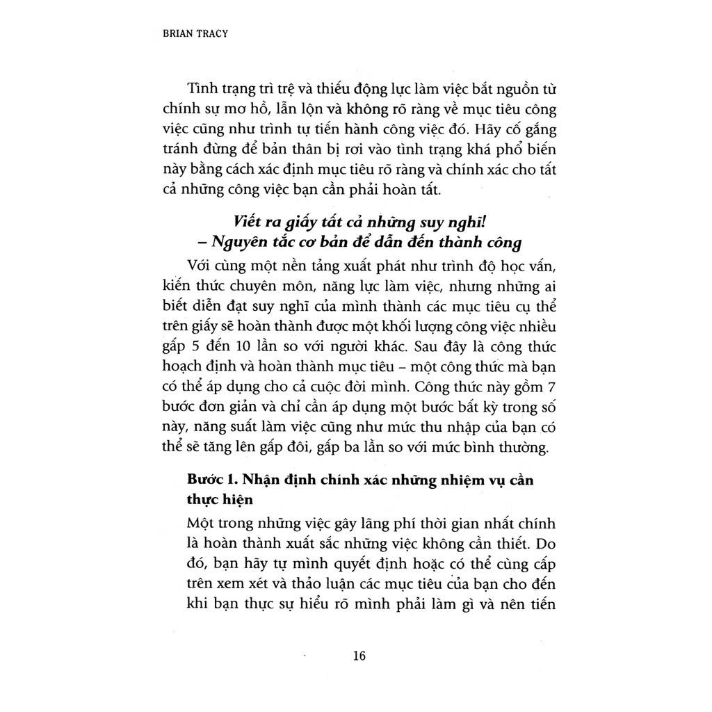 “EAT THAT FROG”: “Nếu việc đầu tiên phải làm vào mỗi buổi sáng là ăn một con ếch sống, thì hãy thực hiện ngay để được hưởng trọn vẹn một ngày thoải mái với ý nghĩ rằng điều kinh khủng kia đã thực hiện xong. Như thế sẽ dễ chịu hơn là cứ để nó ám ảnh suốt cả một ngày dài." “Nếu phải ăn hai con ếch, hãy chọn con xấu nhất." “Nếu buộc phải ăn một con ếch, hãy bắt đầu ngay vì sự chần chừ, trì hoãn hay mải mê ngắm nghía sẽ khiến bạn chùn bước.” Quả thật là kinh khủng khi hình dung bạn phải ăn một con ếch. Thế nhưng, đây chính là hình ảnh đầy biểu tượng mà Brian Tracy đã sử dụng xuyên suốt quyển sách của mình. “Con ếch xấu xí, thô ráp” kia ngụ ý những nhiệm vụ quan trọng nhất cần phải ưu tiên thực hiện mỗi khi lên kế hoạch làm việc. Nhiệm vụ này có sức tác động mạnh mẽ và tích cực đến sự nghiệp hay cuộc đời, tuy nhiên không phải ai cũng nhận ra được điều này. Hãy xem việc “ăn một con ếch” là một bài trắc nghiệm, hay một thử thách đối với bản thân. Hãy cố gắng cưỡng lại mong muốn chọn những việc dễ dàng, đơn giản để làm trước bằng cách liên tục nhắc nhở bản thân rằng: một trong những quyết định quan trọng nhất cần phải thực hiện mỗi ngày chính là quyết định lựa chọn đâu là việc cần tiến hành ngay và đâu là việc có thể tạm gác lại.