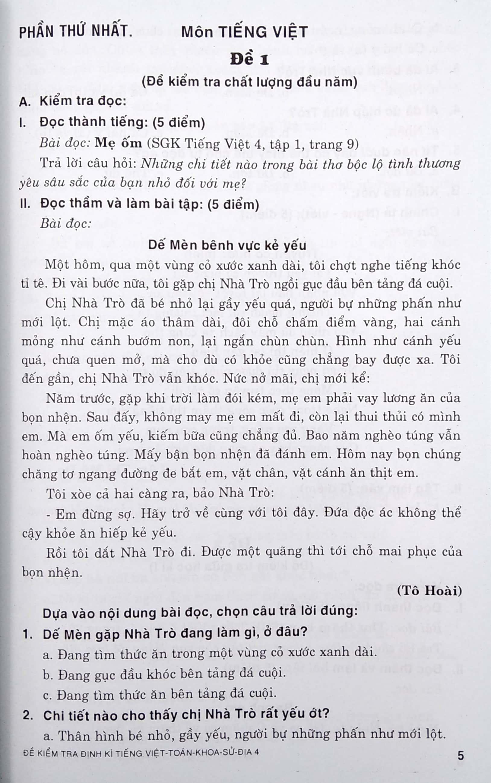 Lớp 4 cấp tiểu học, các em được tiếp nhận một chương trình học đa dạng và phong phú. Học tốt các môn học ở lớp 4, giúp các em có nền tảng vững chắc cho việc học tập ở các lớp trên. Để giúp các em có tài liệu ôn tập, củng cố kiến thức đã học và chuẩn bị tốt cho các đợt kiểm tra định kì, chúng tôi xin giới thiệu quyển sách: Đề Kiểm Tra Định Kỳ Tiếng Việt -Toán - Khoa Học - Lịch Sử - Địa Lý Lớp 4.