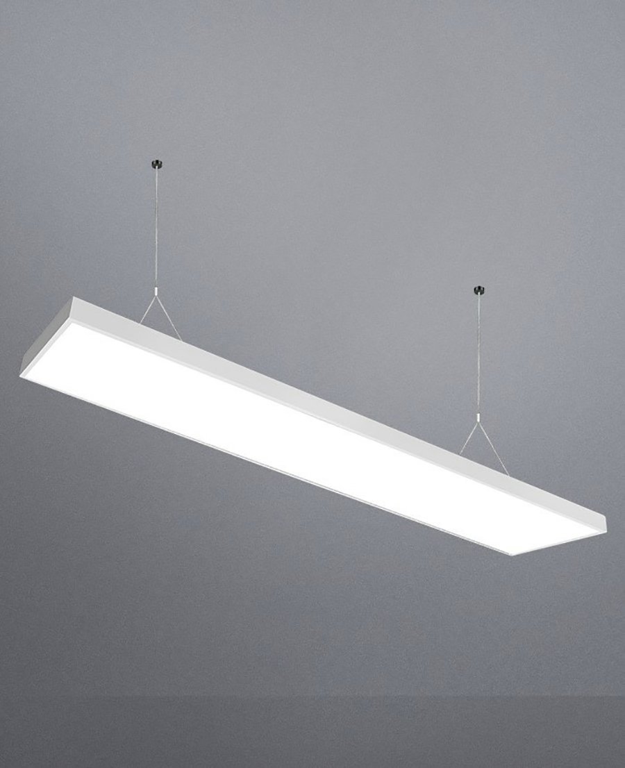 Mẫu đèn LED thanh thả trần này có khổ hình chữ nhật. Trong đó khung viền được làm từ hợp kim nhôm cao cấp. Chi tiết này được phun sơn tĩnh điện để ngăn chặn tình trạng oxy hóa do độ ẩm gây ra.