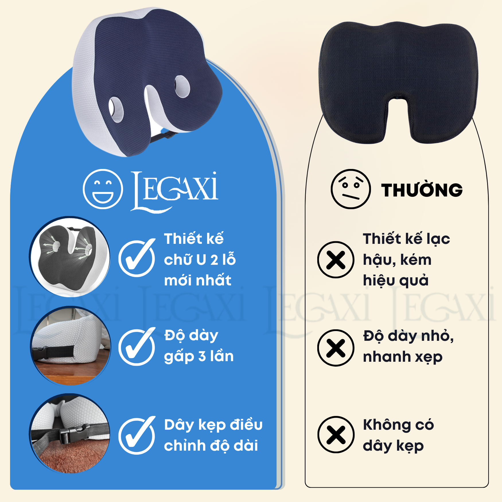 - Thiết kế đường cong từ mông xuống đùi, hỗ trợ và ôm chặt mông, hấp thụ toàn bộ áp lực của cơ thể. Do đó giúp xương cụt hoặc hậu môn (với người bệnh trĩ) không bị đè nén gây đau đớn.