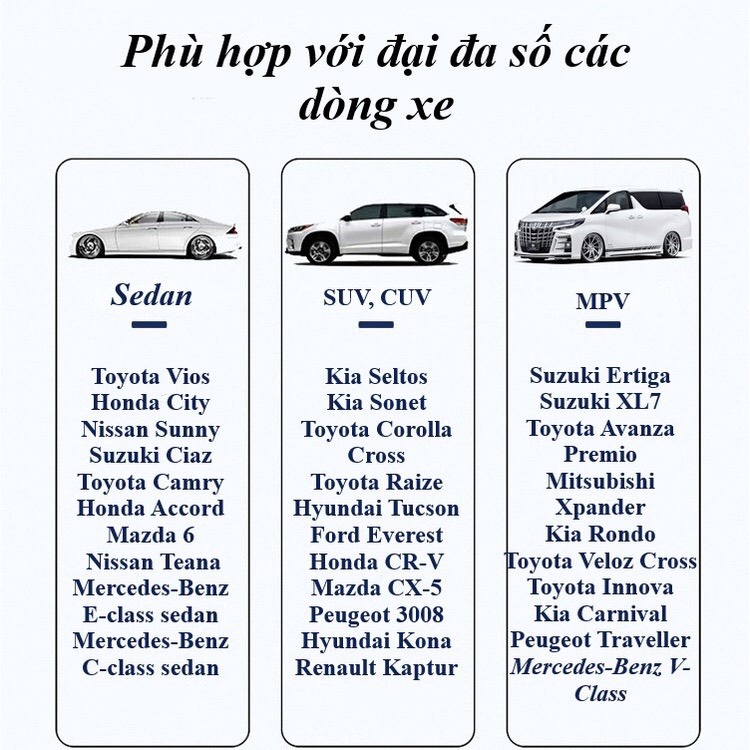 - Phù hợp với đủ các loại xe: SEDAN, SUV, MPV.