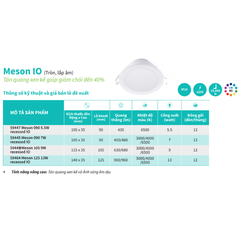 Đường kính khoét lỗ / Công suất: 110/12W. Dải điện áp hoạt động: (150V - 250V)/50Hz Quang thông: 930lm/910lm Nhiệt độ màu: Sáng trắng 6500K/ Sáng vàng 3000K Kích thước (ØxH): (138x50)mm ĐK lỗ khoét
