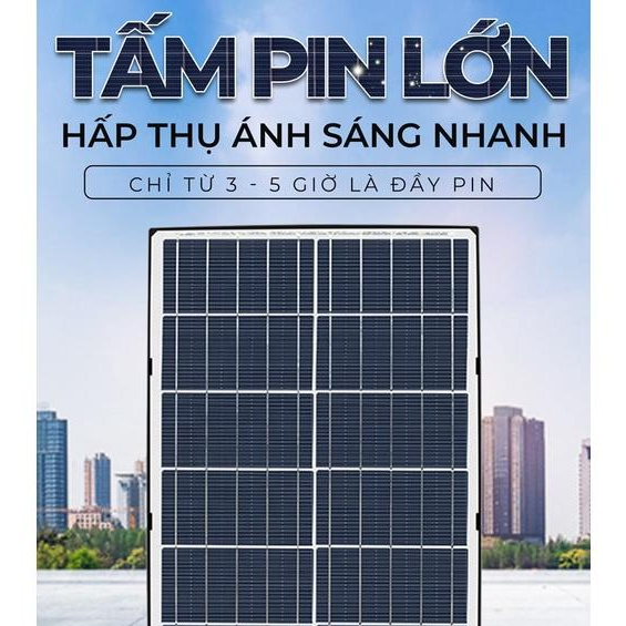 THÔNG SỐ KỸ THUẬT: - Tấm pin năng lượng: Poly 5V/25W - Chip led: SMD5730-240PCS - Lumen: 2000LM - Cấp bảo vệ: IP65 - Pin lưu trữ: Lithium 3,2V/25000mAh - Thời gian sạc: 5h nắng
