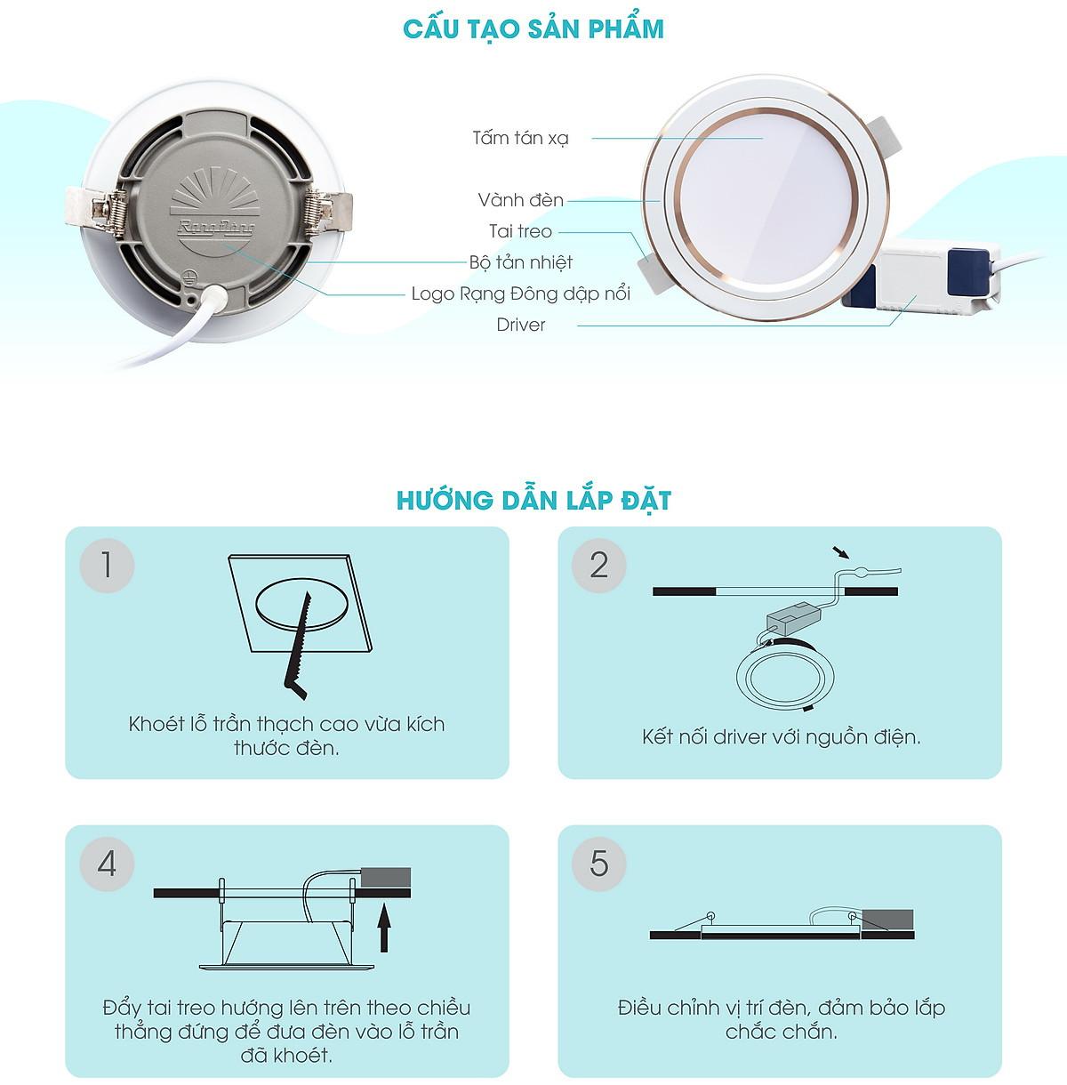 Công suất: 10W Điện áp: 220V/50Hz Quang thông: 1000lm Đổi 3 màu ánh sáng: Trắng/Vàng/Trung tính Kích thước (ØxH): (123x45)mm ĐK lỗ khoét trần: 110mm - Sử dụng Chip LED Hàn Quốc đạt độ tin