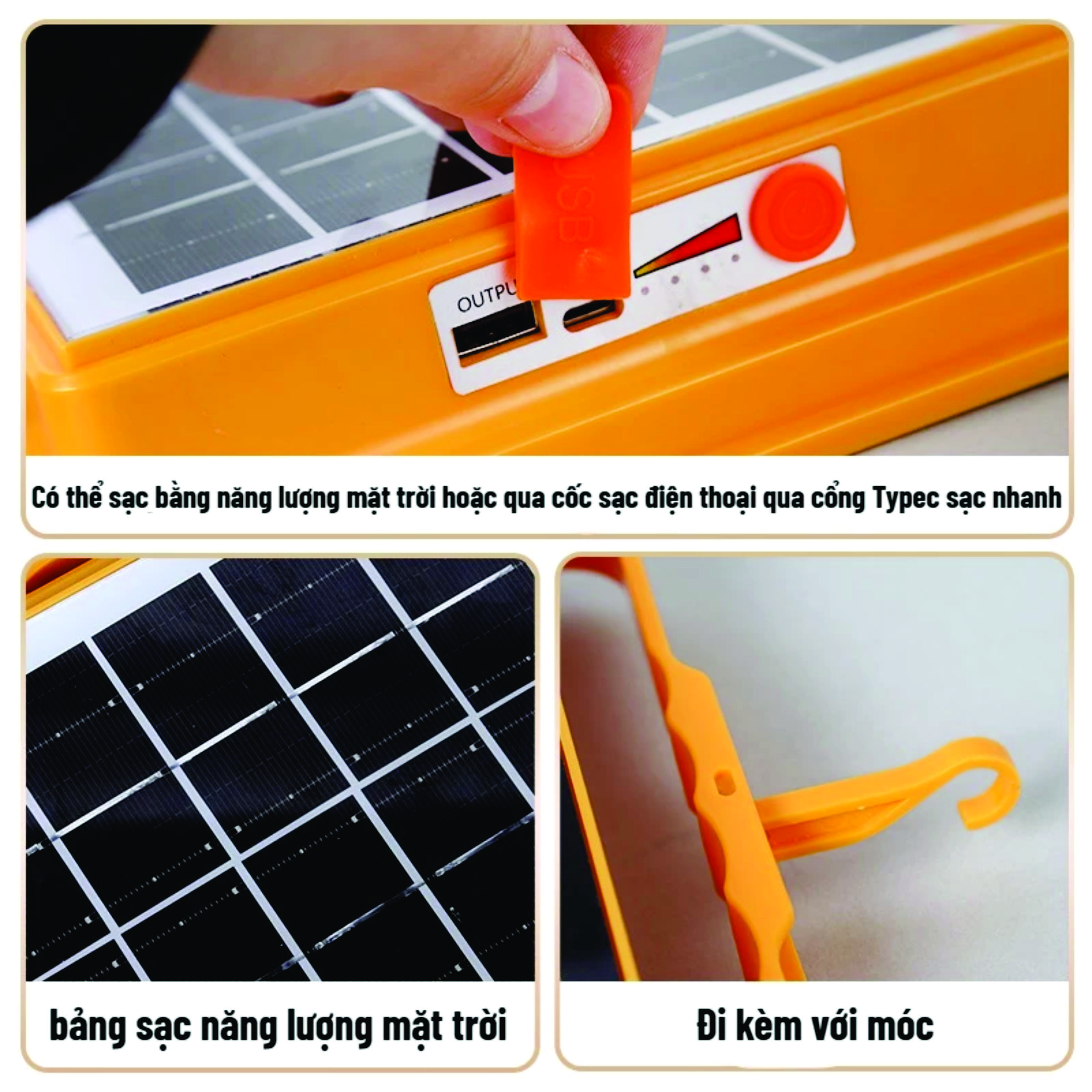 - Có 4 chế độ sáng (Thay đổi chế độ bằng cách ấn nút ) :Chế độ 1 Ánh sáng trắng :Chế độ 2 Ánh sáng Vàng :Chế độ 3 Ánh sáng Trung Tính- Trắng Nhiều Hơn Vàng :Chế độ 4 nháy cảnh báo khẩn cấp. ️- Chức năng chống nước IP66 để được ngoài trời mưa ️- Thích hợp cho các trung tâm mua sắm, khách sạn, nhà cửa, cắm trại ngoài trời , Chợ đêm. ️- Đèn được thiết kế móc treo tiện lợi, phù hợp mọi không gian khác nhau ️- Dùng để chiếu sáng trong nhà hoặc ngoài trời, khi mất điện hoặc sử dụng cho mục đích tiết kiệm điện. ️- Có thể sạc bằng năng lượng mặt trời hoặc qua cốc sạc điện thoại qua cổng Typec sạc nhanh HƯỚNG DẪN SỬ DỤNG : Sạc 5V từ củ sạc hay mang phơi nắng để sạc năng lượng mặt trời
