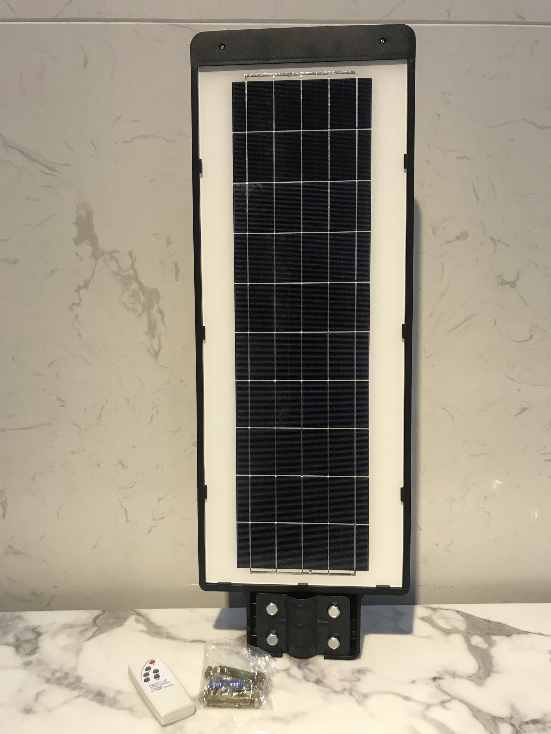 Thông số kỹ thuật: Đèn đường 450W Vật liệu vỏ: nhựa ABS Thời gian nắng để sạc : 6-8h Thời gian chiếu sáng: 8h-12h Điện áp: 6V 25w kích thước đèn :595*340mm kích thước