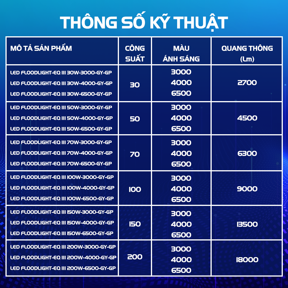 Mô tả sản phẩm: - Đèn pha Lunar 3 được Tập đoàn Hibeam Malaysia thiết kế với chíp led Hàn quốc Seoul Semiconductor cho hiệu suất cao hơn 90lm/w, PF 0.9 - Tuổi thọ 30.000