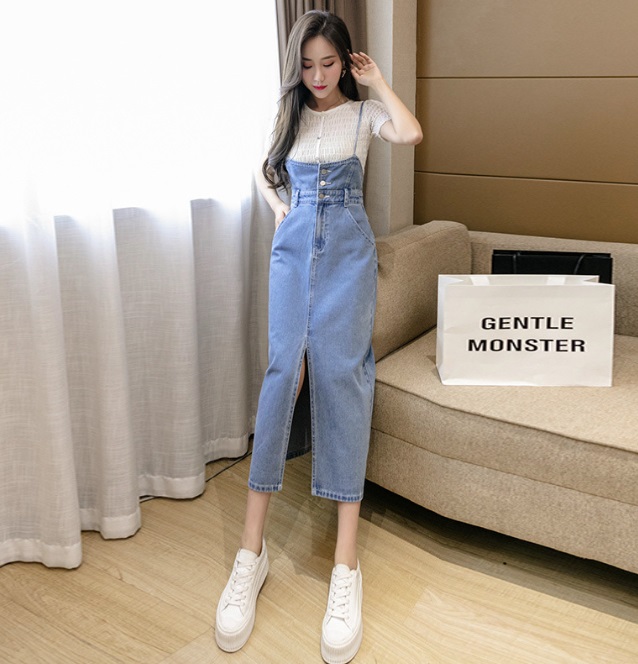 - [ĐẸP CHẤT] Đầm yếm jean dài cài nút xẻ tà dáng suông mềm mại năng động Màu xanh sáng wax bạc