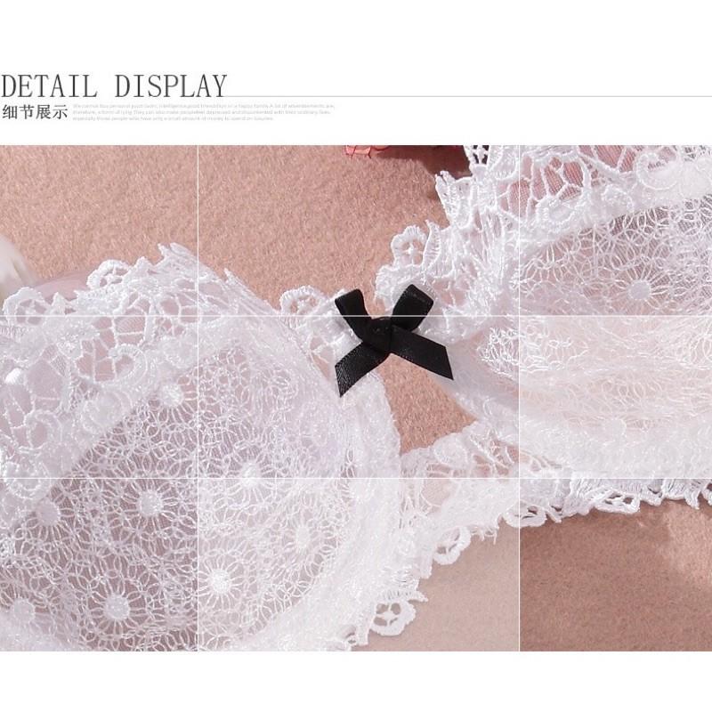 chất ren thoải mái thân thiện với làn da nhạy cảm nhất,kết hợp với vải cotton thoáng khí thoải mái với lớp lót áo sợi lưới thiết kế dây đeo vai rất phù hợp, sườn đàn hồi tốt, có 2 hàng và 3 nút khóa cài . Đáy quần có 2 lớp với lớp vải cotton khoáng khi hút ẩm tốt.