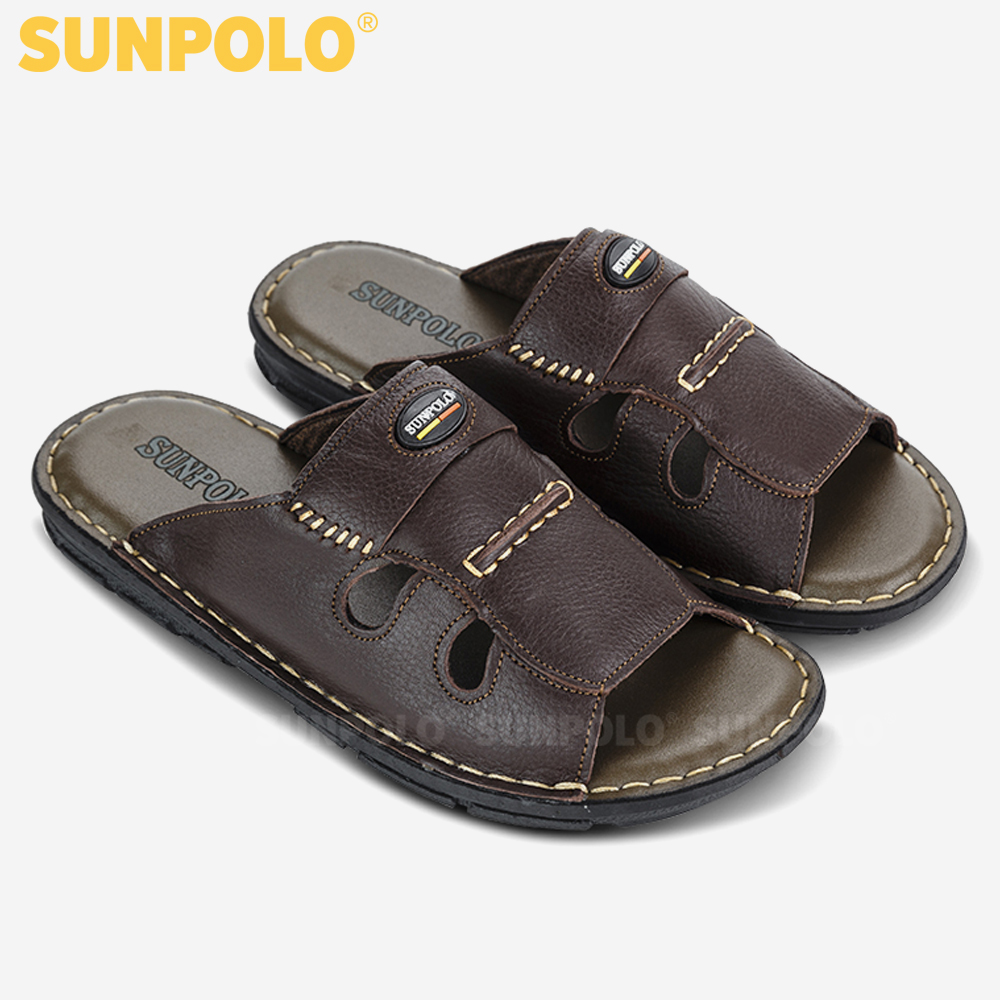 Mua tại Tiktok- Dép nam quai ngang da bò SUNPOLO AQN005 - Nâu được may từ chất liệu da bò cao cấp mềm mịn.