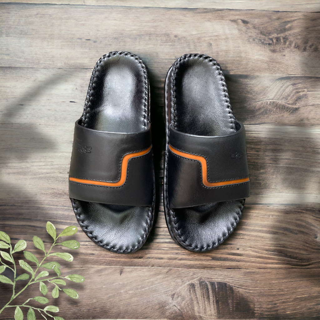 Dép Da Nam  - Lịch Lãm & Thoải Mái Mỗi Ngày - Chất liệu cao cấp: Sử dụng da tổng hợp chất lượng, mềm mại, bền bỉ theo thời gian, mang lại cảm giác êm ái và thoáng khí cho bàn chân. - Thiết kế sang trọng: Tông màu đen lịch lãm, kết hợp với đường chỉ may tinh tế và logo kim loại nổi bật – tôn lên vẻ nam tính, trưởng thành. - Đế chống trượt: Đế EVA siêu nhẹ, độ đàn hồi tốt, kết hợp vân đế tăng độ ma sát – an toàn khi di chuyển trên nhiều bề mặt. - Form ôm chân: Thiết kế bản quai ngang rộng, ôm gọn bàn chân nhưng không gây bí bách, dễ xỏ vào – thích hợp cho người trung niên và người lớn tuổi. - Ứng dụng đa năng: Phù hợp sử dụng trong nhà, đi dạo phố, đến văn phòng hoặc các dịp gặp gỡ thân mật. Lựa chọn tuyệt vời cho quý ông yêu thích sự thoải mái, đơn giản nhưng vẫn giữ được nét tinh tế trong từng bước chân.