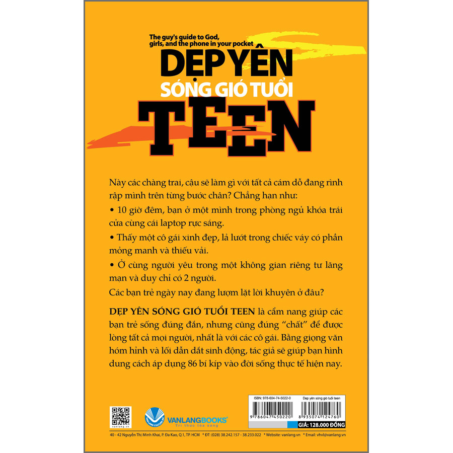 Này các chàng trai, cậu sẽ làm gì với tất cả cám dỗ đang rình rập mình trên từng bước chân? Chẳng hạn như: • 10 giờ đêm, bạn ở một mình trong phòng ngủ khóa trái cửa cùng cái laptop rực sáng. • Thấy một cô gái xinh đẹp, lả lướt trong chiếc váy có phần mỏng manh và thiếu vải. • Ở cùng người yêu trong một không gian riêng tư lãng mạn và duy chỉ có 2 người. Các bạn trẻ ngày nay đang lượm lặt lời khuyên ở đâu? Dẹp Yên Sóng Gió Tuổi Teen là cẩm nang giúp các bạn trẻ sống đúng đắn, nhưng cũng đúng “chất” để được lòng tất cả mọi người, nhất là với các cô gái. Bằng giọng văn hóm hỉnh và lối dẫn dắt sinh động, tác giả sẽ giúp bạn hình dung cách áp dụng 86 bí kíp vào đời sống thực tế hiện nay.