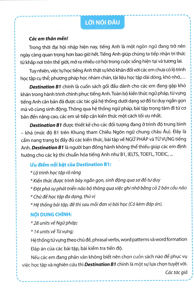 Destination B1 chính là cuốn sách gối đầu dành cho các em đang gặp khó khăn trong hành trình chinh phục tiếng Anh. Toàn bộ kiến thức ngữ pháp, từ vựng tiếng Anh căn bản đã được các tác giả hệ thống dưới dạng sơ đồ tư duy ngắn gọn mà vô cùng sinh động. Thông qua hệ thống ngữ pháp, bài tập trọng tâm đi từ cơ bản đến nâng cao, các em sẽ tiếp cận kiến thức một cách tối ưu nhất.