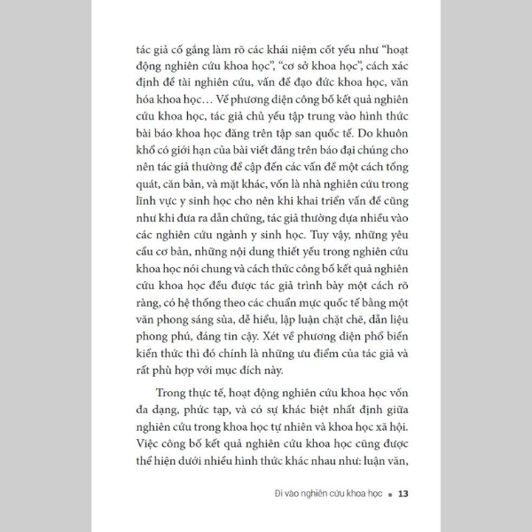 Cuốn sách này ra đời trên cơ sở tập hợp những bài viết về hai nội dung chính: nghiên cứu khoa học và việc công bố kết quả nghiên cứu khoa học. Trong phần đầu, tác giả cố gắng làm rõ các khái niệm cốt yếu như “hoạt động nghiên cứu khoa học”, “cơ sở khoa học”, cách xác định đề tài nghiên cứu, vấn đề đạo đức khoa học, văn hóa khoa học… Về phương diện công bố kết quả nghiên cứu khoa học, tác giả chủ yếu tập trung vào hình thức bài báo khoa học đăng trên tập san quốc tế. Do khuôn khổ có giới hạn của bài viết đăng trên báo đại chúng cho nên tác giả thường đề cập đến các vấn đề một cách tổng quát, căn bản, và mặt khác, vốn là nhà nghiên cứu trong lĩnh vực y sinh học cho nên khi khai triển vấn đề cũng như khi đưa ra dẫn chứng, tác giả thường dựa nhiều vào các nghiên cứu ngành y sinh học. Tuy vậy, những yêu cầu cơ bản, những nội dung thiết yếu trong nghiên cứu khoa học nói chung và cách thức công bố kết quả nghiên cứu khoa học đều được tác giả trình bày một cách rõ ràng, có hệ thống theo các chuẩn mực quốc tế bằng một văn phong sáng sủa, dễ hiểu, lập luận chặt chẽ, dẫn liệu phong phú, đáng tin cậy. Xét về phương diện phổ biến kiến thức thì đó chính là những ưu điểm của tác giả và rất phù hợp với mục đích xuất bản của Tủ sách Kiến thức này.