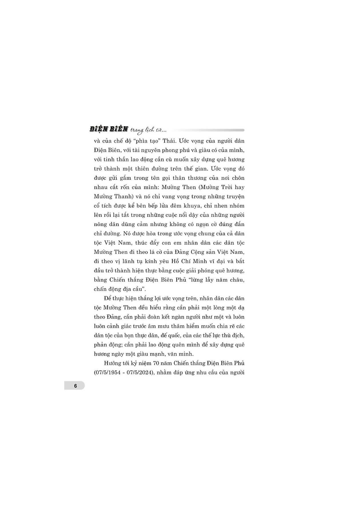 Mua tại TiktokĐiện Biên Phủ Trong Lịch Sử - Thuở Ban Đầu Đến Năm 1964 Sách gồm bảy chương, phác họa một cách có hệ thống lịch sử của Điện Biên từ thuở ban đầu đến năm 1954, giúp người dân Điện Biên cũng như bạn đọc cả nước hiểu Điện Biên không phải chỉ qua Chiến thắng Điện Biên Phủ, mà còn đưa tầm mắt vượt qua nhiều thế kỷ của quá khứ để tin tưởng vững chắc thêm vào hướng đi của tương lai đất nước cũng như của tỉnh Điện Biên.