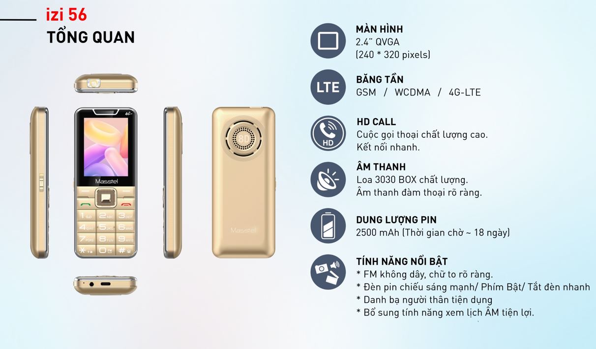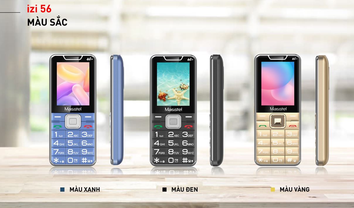 Thắng thao mobile cam kết Hàng chính hãng mới 100% Bảo hành 12 tháng Cấu hình sản phẩm : - Màu Sắc Black, Blue, Gold - Dung Lượng Pin 2500mAh - Hỗ trợ sim: 2 Sim 2 Sóng - Màn Hình: 2.4" QVGA - FM không dây, chữ to rõ ràng - Đèn pin chiếu sáng mạnh/ Phím Bật/Tắt đèn nhanh - Danh bạ người thân tiện dụng - Bổ sung tính năng xem lịch ÂM tiện lợi Masstel trình làng Masstel IZI 56 mẫu điện thoại phổ thông hỗ trợ 4G VoLTE thuộc series IZI, sở hữu thiết kế thân thiện, chip xử lý Unisoc, thời lượng pin ấn tượng và nhiều tính năng tiện ích. Thiết kế truyền thống, dễ thao tác Masstel IZI 56 chế tác theo đúng chuẩn thiết kế “cục gạch” mà bạn vẫn quen thuộc với mặt trước gồm 2 phần, phần trên là màn hình và phần dưới là bàn phím vật lý với các nút nhấn lớn được ký hiệu chi tiết cho người dùng bấm chính xác. Màn hình có kích thước 2.4 inch, độ phân giải QVGA (240 x 320 Pixels), 262.000 màu hiển thị chữ viết to rõ, đầy đủ nội dung, nhìn thoải mái và dễ thao tác. Ở cạnh trên điện thoại có quả đèn pin cho độ sáng cao, buổi tối khi cần tìm đồ vật bạn có thể trực tiếp mở đèn pin này mà không cần bật đèn bàn, đèn phòng. Chất liệu sử dụng rất đáng tin cậy, với khung viền kim loại cứng cáp, vỏ máy bằng nhựa PC và ABS cho khả năng chống chịu lực tốt, an toàn ngay cả trong môi trường thay đổi nhiệt độ. Mặc dù được Masstel nhấn mạnh là điện thoại dành cho người lớn tuổi nhưng em ấy cũng rất xứng đôi với các bạn trẻ nhờ kiểu dáng hiện đại, nhỏ xinh và màu sắc thì cực yêu, ngoài màu đen lịch lãm, Masstel IZI 56 còn có màu vàng tươi tắn, thời trang, cho bạn chọn tùy thích. Nâng cao chất lượng cuộc gọi nhờ công nghệ 4G VoLTE hiện đại Điện thoại này được Masstel chuyển đổi từ công nghệ GSM sang 4G VoLTE tín hiệu không dây chất lượng tốt, hạn chế được tình trạng mất tín hiệu trong quá trình sử dụng, mang đến âm thanh trung thực cho mọi cuộc gọi đồng thời giúp tiết kiệm pin tối đa.
