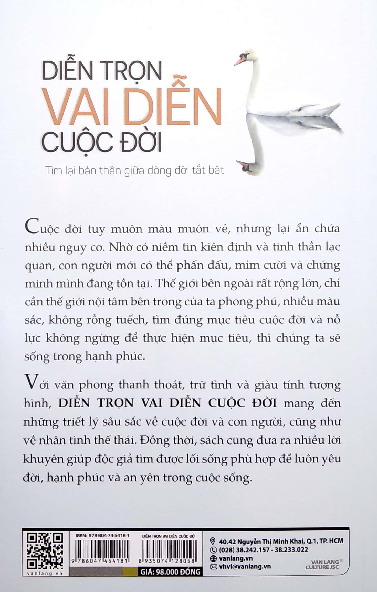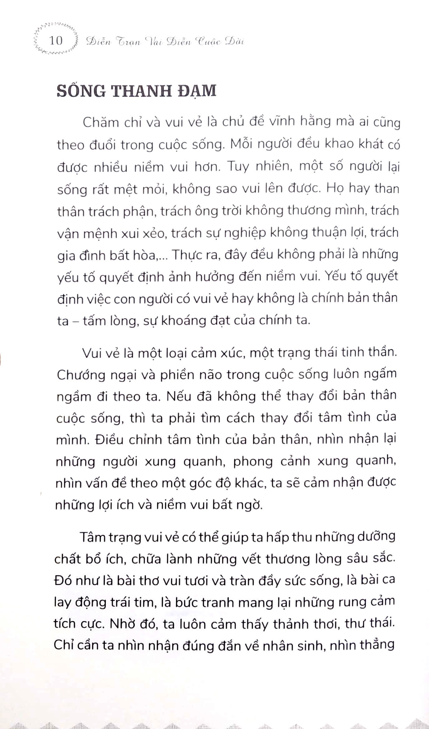 Với văn phong thanh thoát, trữ tình và giàu tính tượng hình, Diễn trọn vai diễn cuộc đời mang đến những triết lý sâu sắc về cuộc đời và con người, cũng như về nhân tình thế thái. Đồng thời, sách cũng đưa ra nhiều lời khuyên giúp độc giả tìm được lối sống phù hợp để luôn yêu đời, hạnh phúc và an yên trong cuộc sống.