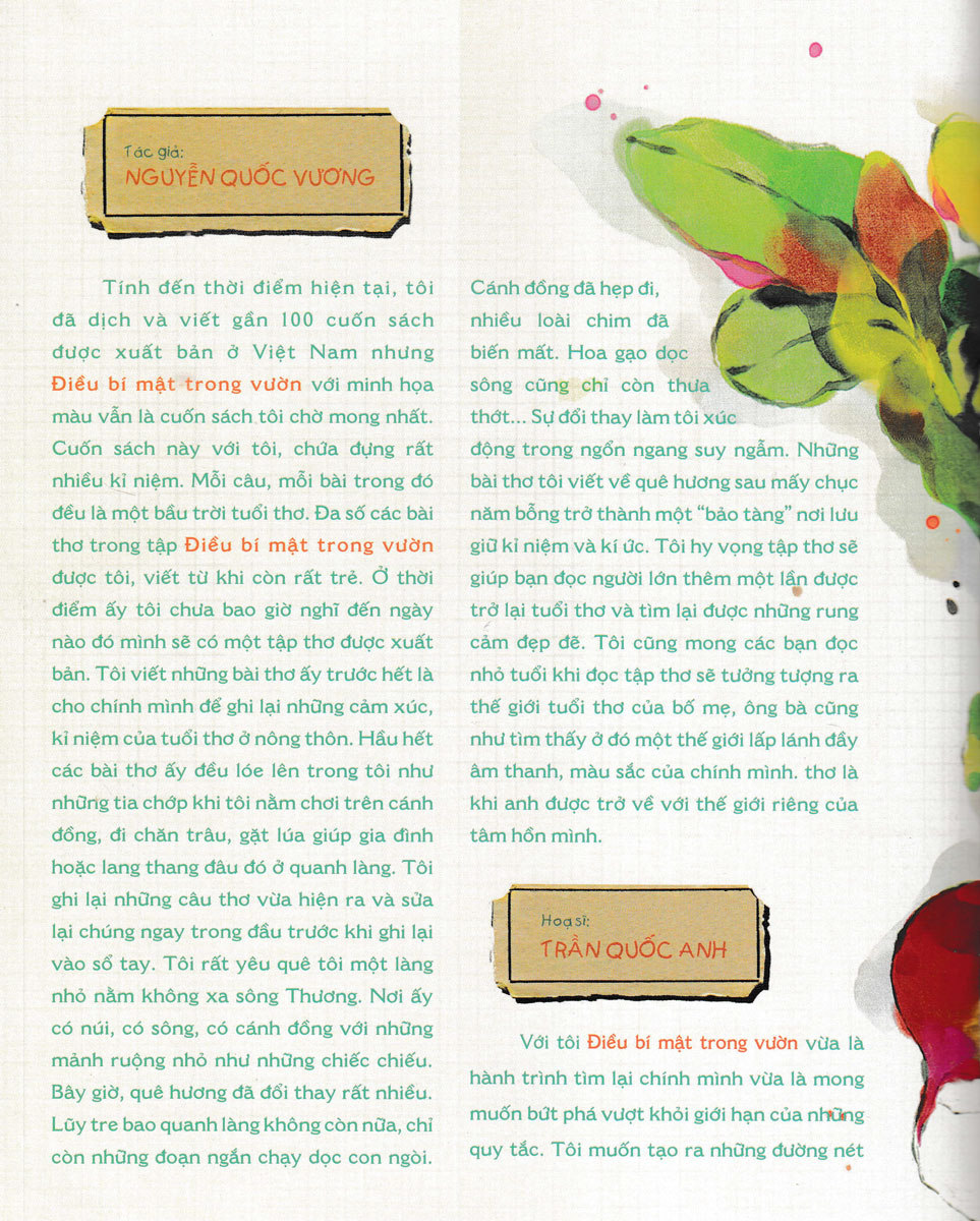 Tính đến thời điểm hiện tại, tôi đã dịch và viết gần 100 cuốn sách được xuất bản ở Việt Nam nhưng Điều Bí Mật Trong Vườn với minh họa màu vẫn là cuốn sách tôi chờ mong nhất. Cuốn sách này với tôi, chứa đựng rất nhiều kỉ niệm. Mỗi câu, mỗi bài trong đó đều là một bầu trời tuổi thơ. Đa số các bài thơ trong tập Điều Bí Mật Trong Vườn được tôi viết từ khi còn rất trẻ. Ở thời điểm ấy tôi chưa bao giờ nghĩ đến ngày nào đó mình sẽ có một tập thơ được xuất bản. Tôi viết những bài thơ ấy trước hết là cho chính mình để ghi lại những cảm xúc, kỉ niệm của tuổi thơ ở nông thôn. Hầu hết các bài thơ ấy đều lóe lên trong tôi như những tia chớp khi tôi nằm chơi trên cánh đồng, đi chăn trâu, gặt lúa giúp gia đình hoặc lang thang đâu đó ở quanh làng. Tôi ghi lại những câu thơ vừa hiện ra và sửa lại chúng ngay trong đầu trước khi ghi lại vào sổ tay. Tôi rất yêu quê tôi-một làng nhỏ nằm không xa mấy sông Thương. Nơi ấy có núi, có sông, có cánh đồng với những mảnh ruộng nhỏ như những chiếc chiếu. Bây giờ, quê hương đã đổi thay rất nhiều. Lũy tre bao quanh làng không còn nữa, chỉ còn những đoạn ngắn chạy dọc con ngòi. Cánh đồng thì hẹp đi, nhiều loài chim đã biến mất. Hoa gạo dọc sông cũng chỉ còn thưa thớt… Sự đổi thay làm tôi xúc động trong ngổn ngang suy ngẫm. Những bài thơ tôi viết về quê hương sau mấy chục năm bỗng trở thành một “bảo tàng” nơi lưu giữ kỉ niệm và kí ức. Tôi hy vọng tập thơ sẽ giúp bạn đọc người lớn thêm một lần được trở lại tuổi thơ và tìm lại được những rung cảm đẹp đẽ. Tôi cũng mong các bạn đọc nhỏ tuổi khi đọc tập thơ sẽ tưởng tượng ra thế giới tuổi thơ của bố mẹ, ông bà cũng như tìm thấy ở đó một thế giới lấp lánh đầy âm thanh, màu sắc của chính mình.