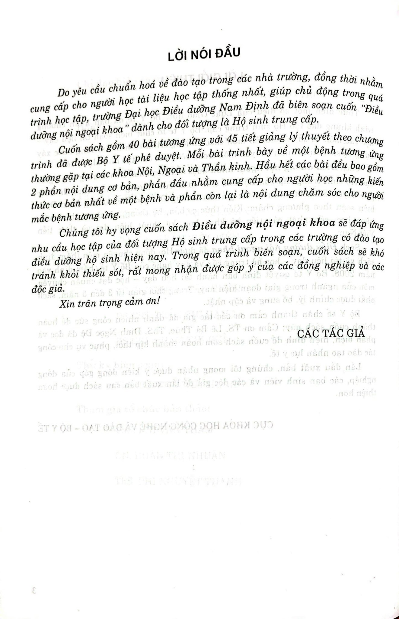 Do yêu cầu chuẩn hoá về đào tạo trong " các nhà trường, đồng thời nhằm đã biên soạn cuốn “Điều cung cấp cho người học tài liệu học tập thống nhất, giúp chủ động trong quá trình học học tập, trường Đại học Điều dưỡng g Nam Định đi sinh trung cấp. lành cho đối tượng là Hộ sinh tru dưỡng nội ngoại khoa” dành cho đối