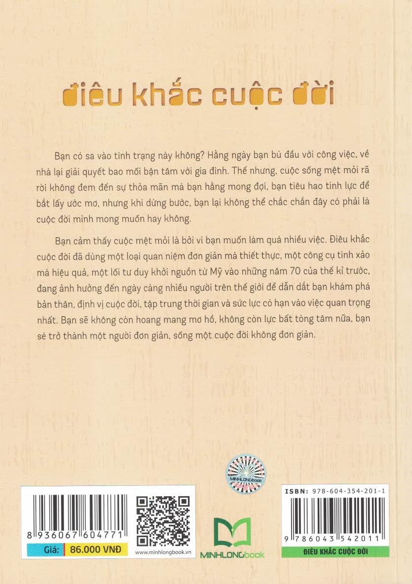 Bạn cảm thấy mệt mỏi là bởi vì bạn muốn làm quá nhiều việc. “Điêu khắc cuộc đời” đã dung một loại quan niệm đơn giản mà thiết thực, một công cụ tinh xảo mà hiệu quả, một lối tư duy khởi nguồn từ Mỹ vào những năm 70 của thế kỉ trước, đang ảnh hưởng đến ngày càng nhiều người trên thế giới để dẫn dắt bạn khám phá bản thân, định vị cuộc đời, tập trung thời gian và sức lực có hạn vào việc quan trọng nhất. Bạn sẽ không còn hoang mang mơ hồ, không còn lực bất tòng tâm nữa, bạn sẽ trở thành một người đơn giản, sống một cuộc đời đơn giản.