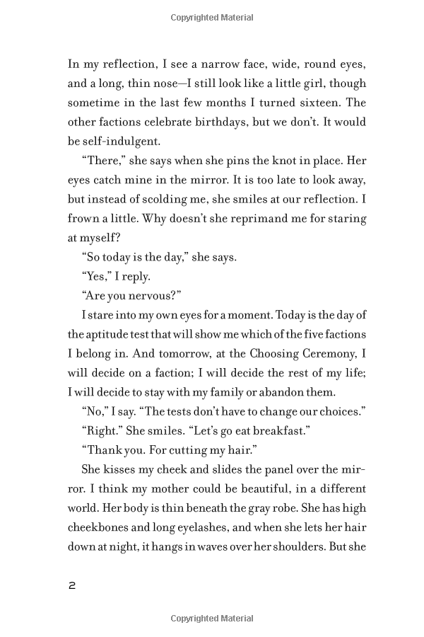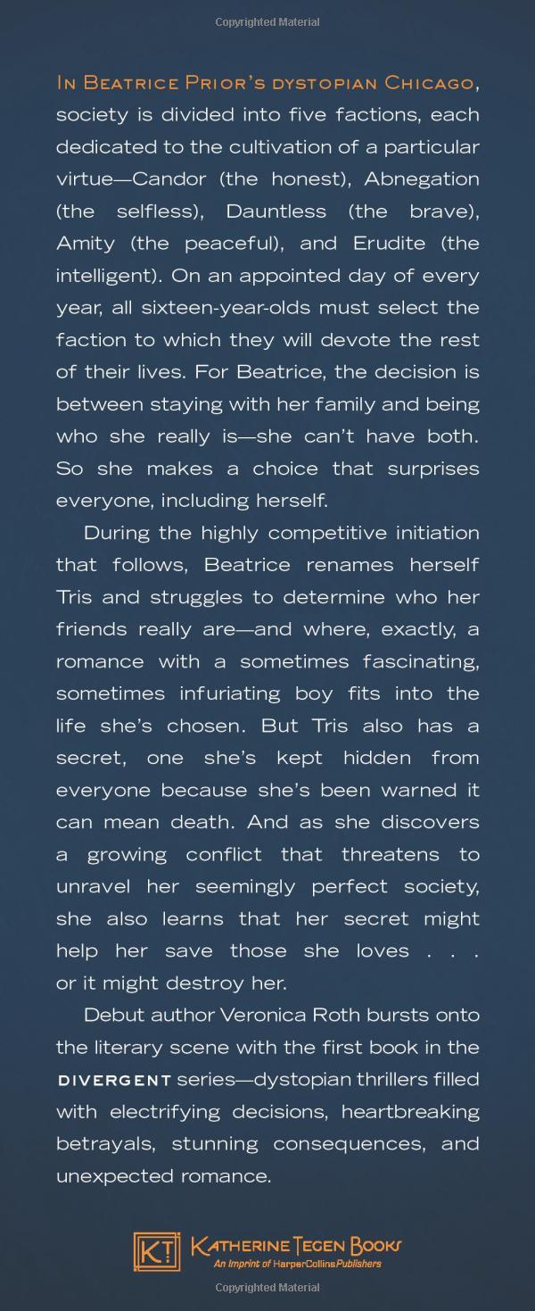 During the highly competitive initiation that follows, Beatrice renames herself Tris and struggles alongside her fellow initiates to live out the choice they have made. Together they must undergo extreme physical tests of endurance and intense psychological simulations, some with devastating consequences. As initiation transforms them all, Tris must determine who her friends really are—and where, exactly, a romance with a sometimes fascinating, sometimes exasperating boy fits into the life she's chosen. But Tris also has a secret, one she's kept hidden from everyone because she's been warned it can mean death. And as she discovers unrest and growing conflict that threaten to unravel her seemingly perfect society, she also learns that her secret might help her save those she loves . . . or it might destroy her.