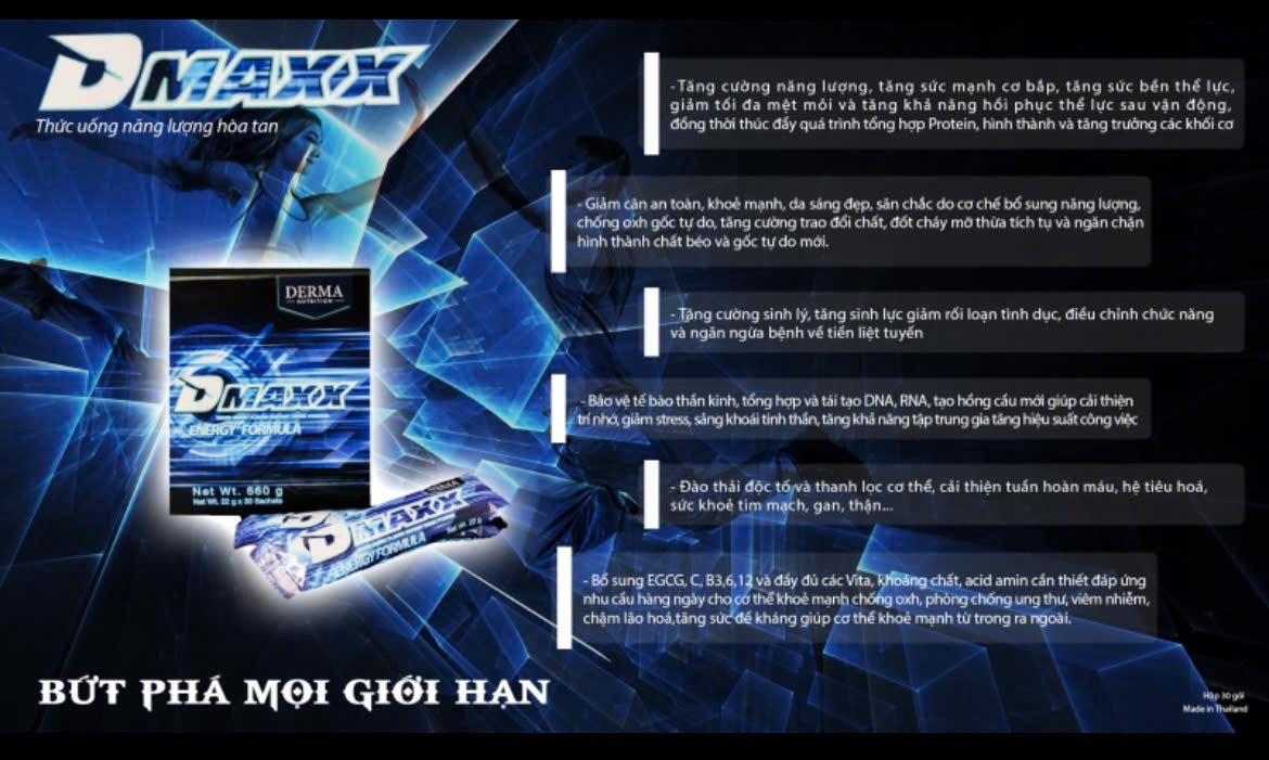 Thức uống năng lượng Dmaxx Energy Formula   Dmaxx energy formula là sản phẩm thức uống năng lượng có chức năng bổ sung năng lượng cho người uống mỗi ngày dưới dạng thức uống hòa
