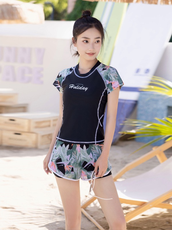 - Mẫu đồ bơi mới nhất cho các bạn nữ thích sự trẻ trung kín đáo mà vẫn thu hút khi đi biển, đi bơi. - Áo dáng ngắn tay phối hoạ tiết trẻ khoẻ,