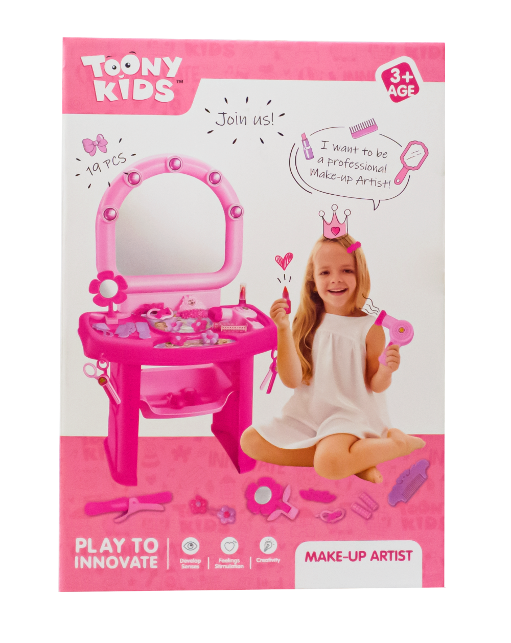 - Bộ bàn trang điểm Toonykids - Makeup Artist là món đồ chơi rất được các bé gái ưa thích, với màu hồng dễ thương cùng họa tiết hoa văn hết sức đáng yêu mang đến sự lộng lẫy cho bé yêu, như một nàng công chúa kiêu kỳ ngồi trang điểm trong thế giới cổ tích.