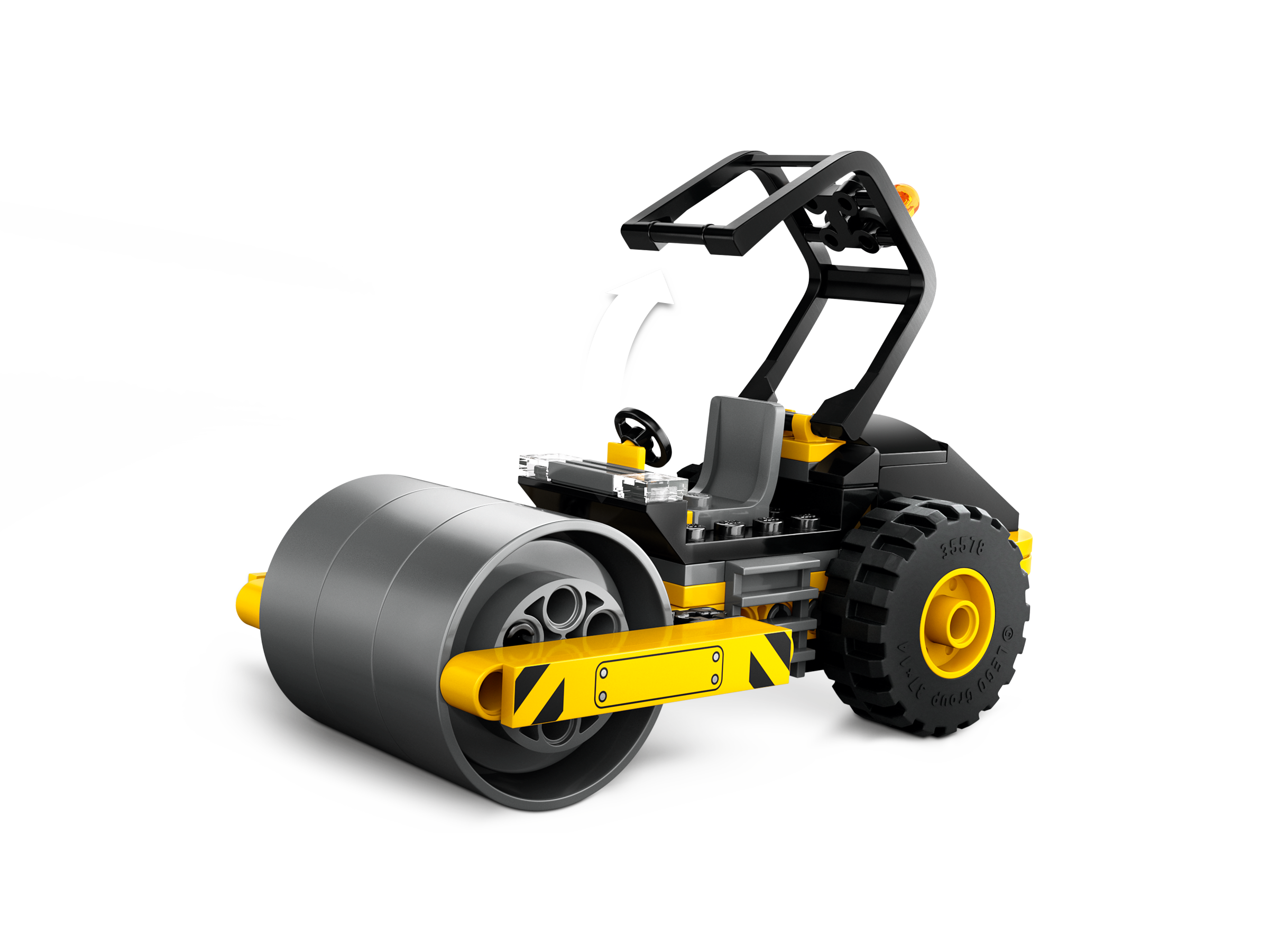 • Đồ chơi lắp ráp Xe lu công trình – Đồ chơi LEGO City với phần bánh xe lớn, cabin lái và đèn hiệu cảnh báo, cùng với mô hình của công nhân xây dựng với một cái xẻng và mũ bảo hiểm.
