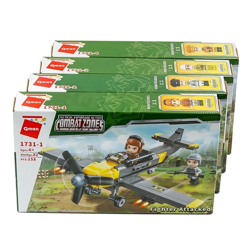 KT 27.4 x 20.7 x 16.7 cmĐộ tuổi 6+Đồ chơi - QMAN - 1731 Bộ đồ chơi xếp hình mô hình máy bay, ô tô  KT 27.4 x 20.7 x 16.7 cm • Sản phẩm nằm trong bộ sưu tập nổi tiếng của QMAN với chủ đề CombatZone...